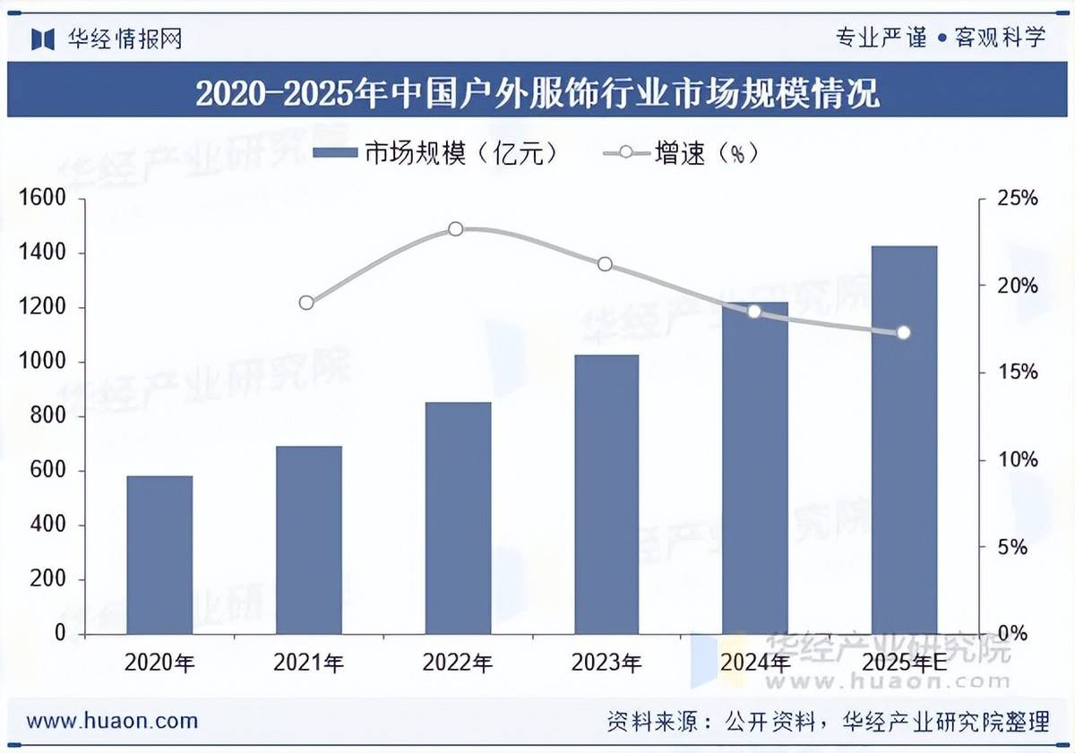 相较于欧美市场超过50%的户外运动渗透率,中国目前的渗透率仍有巨大的提升空间,这预示着市场的广阔前景。特别是在2026年之后,受疫情催化的户外热潮影响,中国户外服饰市场一改此前几年的平缓增长,进入了新一轮的快速增长通道。市场规模从产品销售额、品牌营收等多个维度均呈现出强劲的增长势头。据统计,2024年我国户外服饰行业市场规模达到1220亿元,预计2025年增长至1430亿元。