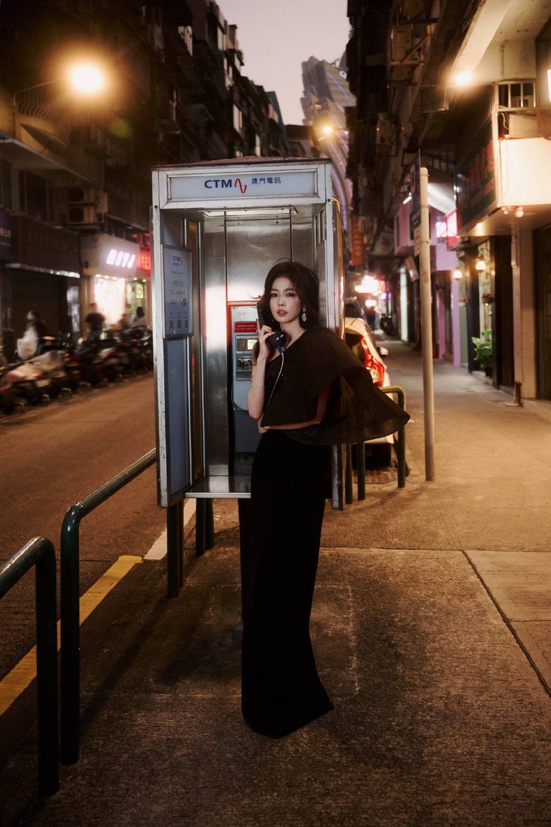 这身造型出自黎巴嫩顶级高定设计师Rami Al Ali 2025秋冬系列,黑色斜肩设计勾勒出优雅锁骨线条,高开叉裙摆若隐若现地展露腿部曲线,搭配De Beers紫钻与蓝钻高级珠宝,冷冽光芒在夜色中流转生辉。拍摄团队别出心裁地将取景地设在澳门街头,暖红与冷蓝交错的霓虹灯牌映照在她复古波浪卷发上,胶片质感滤镜加持下,每一帧都宛如90年代港风电影截图。