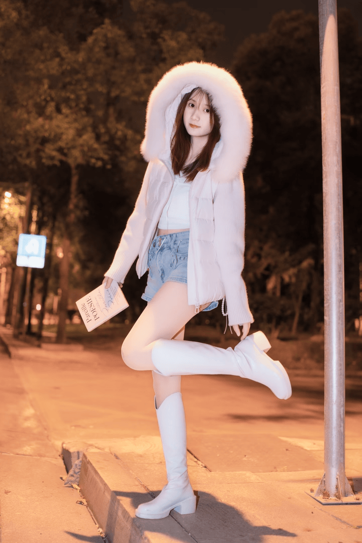 不要呆呆地站着,假装在冬夜的街头漫步。双腿交叉迈步,这样走出来的腿部线条最修长。手里随意拿着书,双手打开看向镜头。羽绒服打开就不会显得臃肿,也不会显得僵硬,抓拍出来的照片充满了生活气息和松弛感。