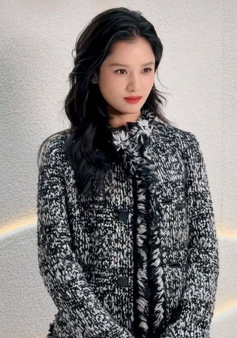 所以造型师也很懂得如何发挥她的颜值特点,为张婧仪选择了一套黑白针织大衣搭配黑色连衣裙。