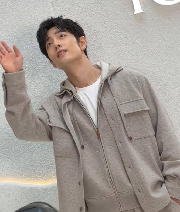 不过,我更喜欢肖战的另一套造型,全灰色的运动套装搭配同色系的工装外套和马丁靴,一整个青春男大的既视感。