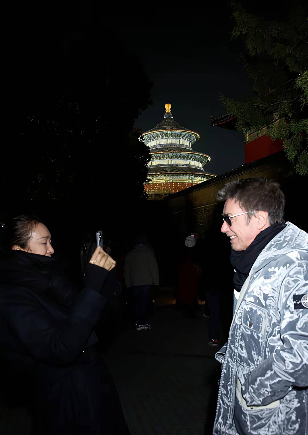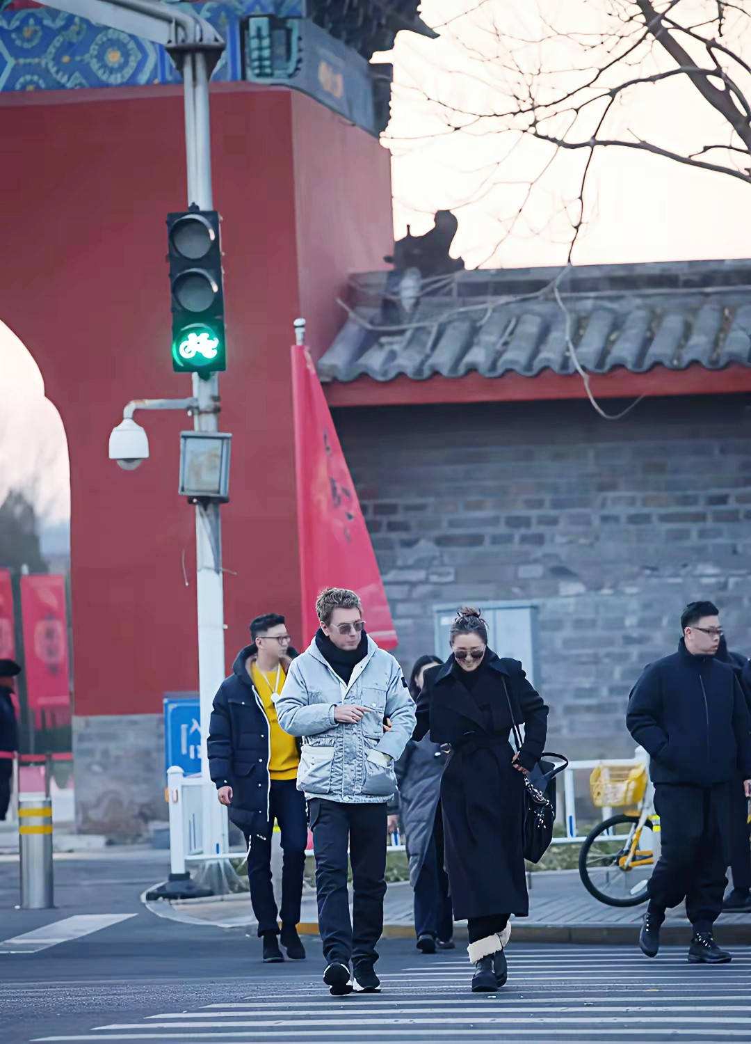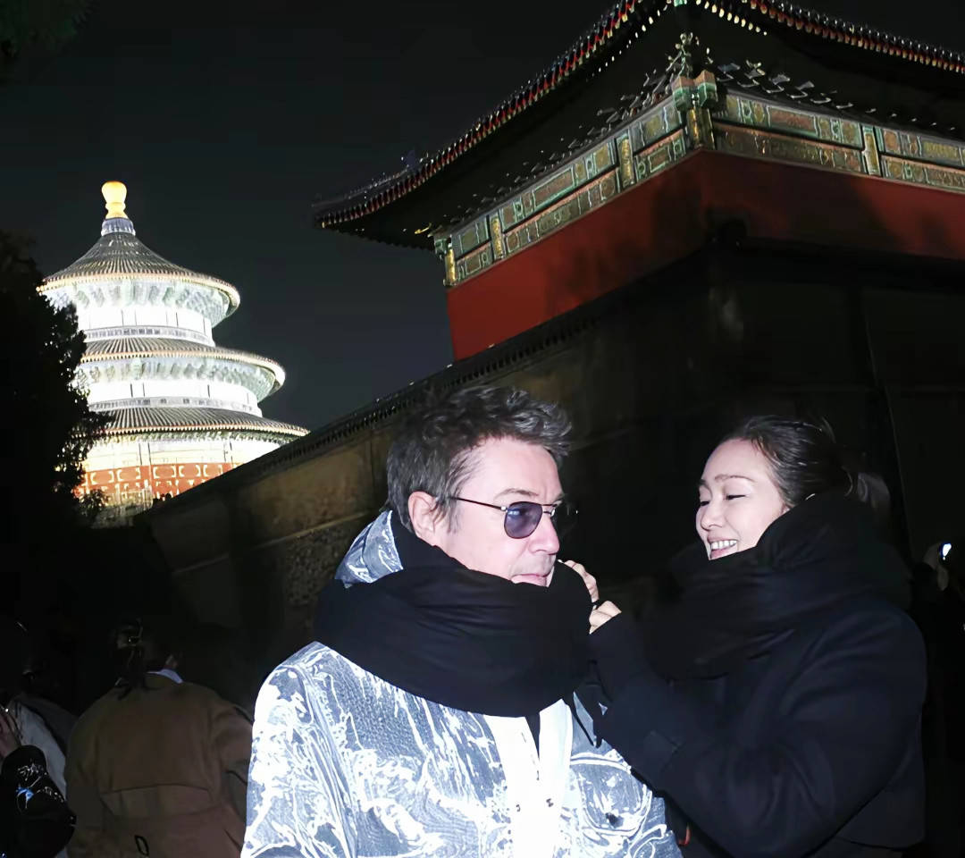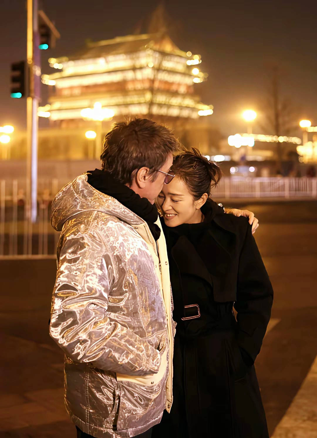 两人时而并肩漫步,从钟鼓楼的晨钟暮鼓走到天安门广场;时而骑行街头,晚风拂过发梢时相视一笑,巩俐为丈夫整理围巾的细致、举手机记录身影的专注,与银幕上的霸气形象形成可爱反差。