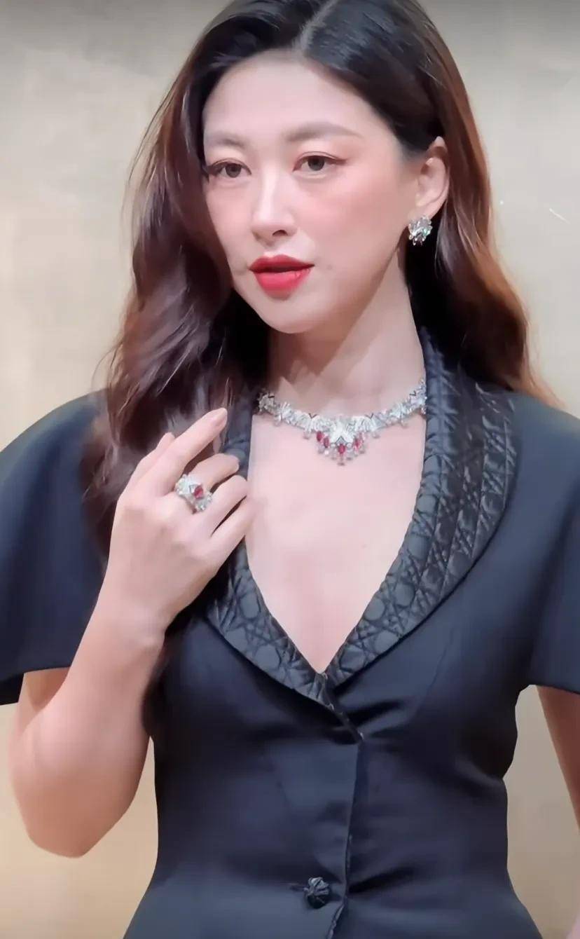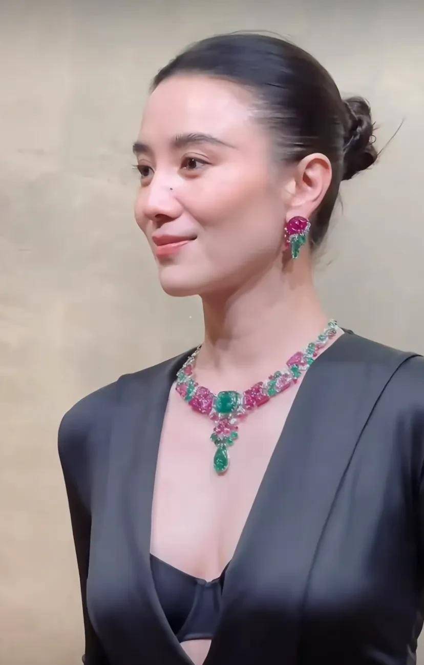 实力派大花宋佳,骨相与气质向来出众,与张婧仪同属大气温润的“地母”类型。她选择了深V设计的黑色礼服,完美勾勒出曼妙身姿,颈间佩戴的绿紫相间珠宝项链,平添了几分神秘与优雅。不过此次露面,宋佳的法令纹较为明显,面部肌肤略有松弛,岁月的痕迹悄然浮现。