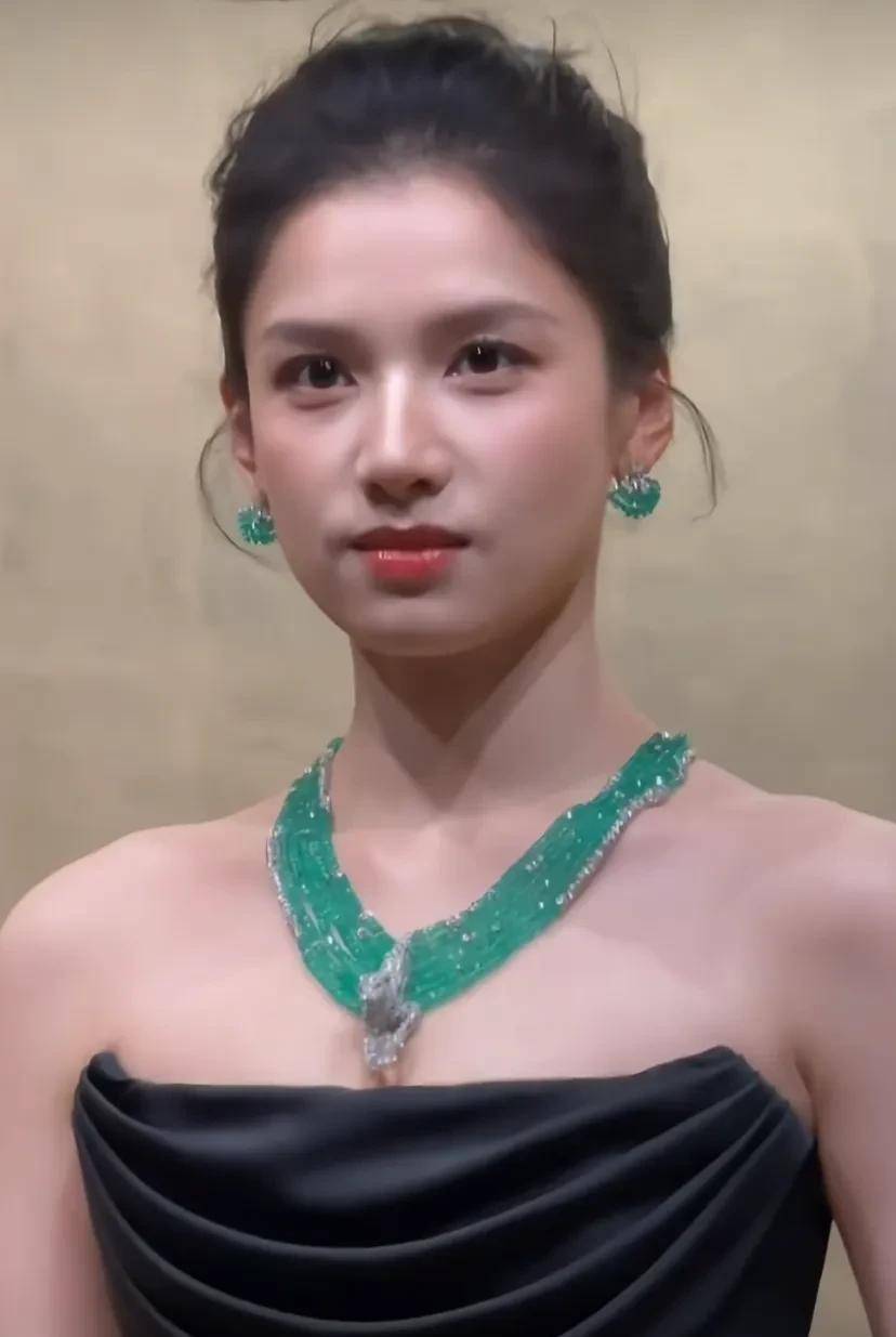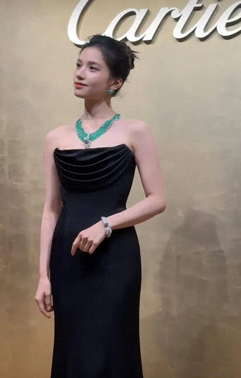新生代小花张婧仪,近来资源颇佳,且每每亮相台风都稳健从容。此次,她以一袭黑色抹胸裙登场,搭配品牌经典的绿色珠宝项链与耳环,更显华贵。丸子头造型将她精致的五官全然展现,仪态万千,光彩照人,确实令人惊叹。