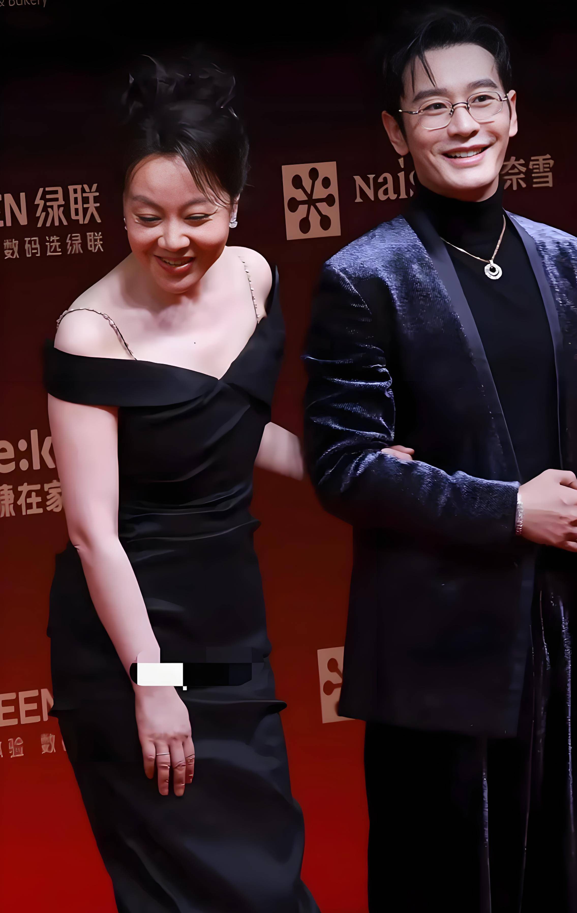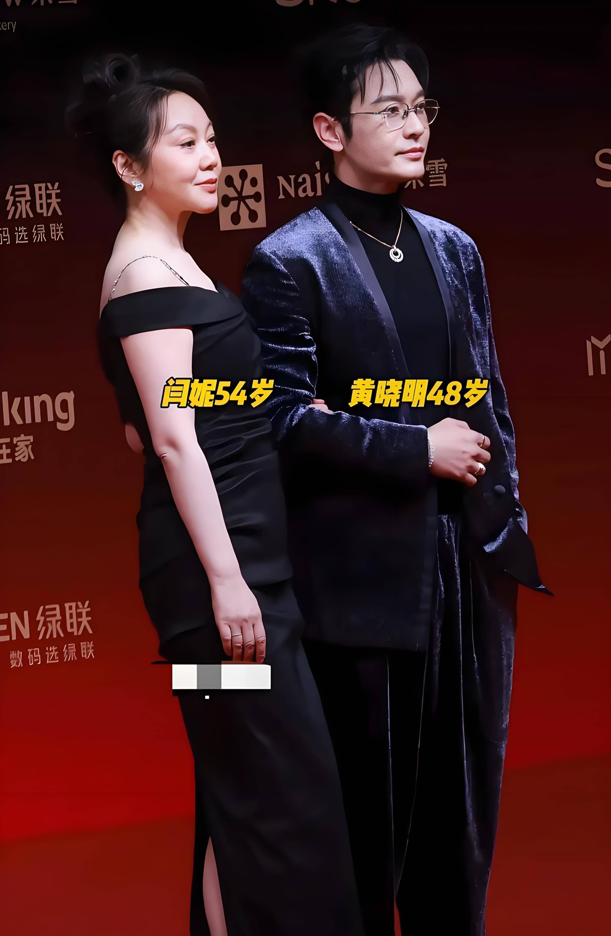 随后,黄晓明与闫妮一同亮相。他身穿蓝银色亮面西装,内搭黑色高领针织衫,金色项链与镜框作为巧妙点缀。