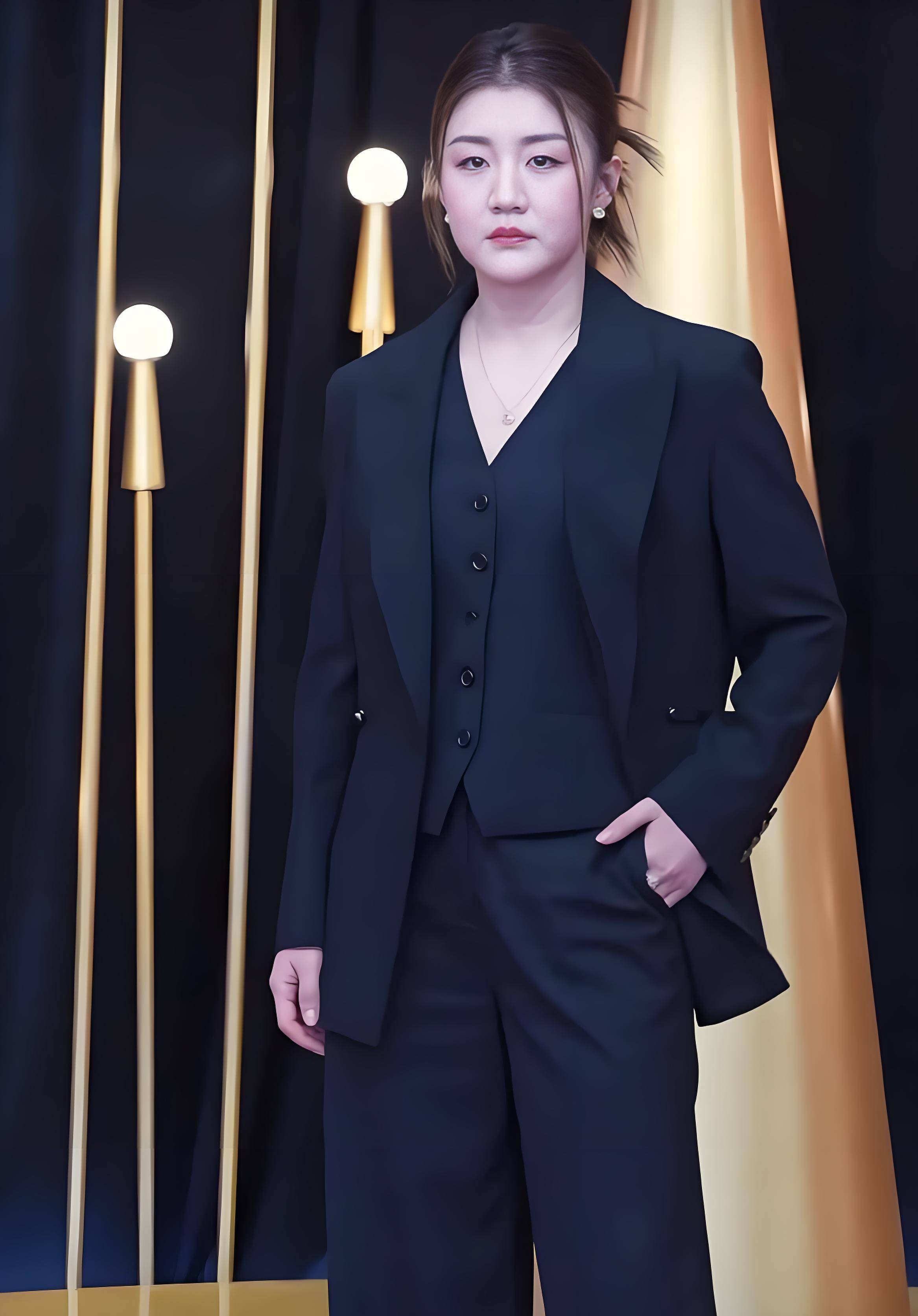 她将长发简单挽起,身着一袭剪裁利落的黑色西装套装,内搭深V领马甲,整体造型简约而有力。