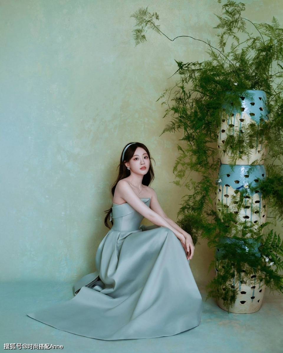 薄荷绿抹胸蓬蓬裙为祝绪丹增添了几分俏皮感。宽大的裙摆与修身上半身形成对比,进一步强调了她的纤细腰身。她慵懒地倚靠在白色物体上,单手托腮,眼神中带着一丝朦胧,仿佛刚刚从春日小憩中醒来。