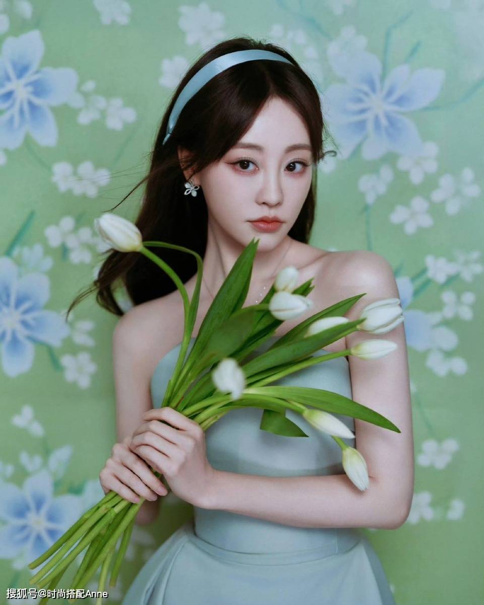 她双手捧着花束的姿态,让人联想到古典油画中的春之女神。不造作,不刻意,一切浑然天成。