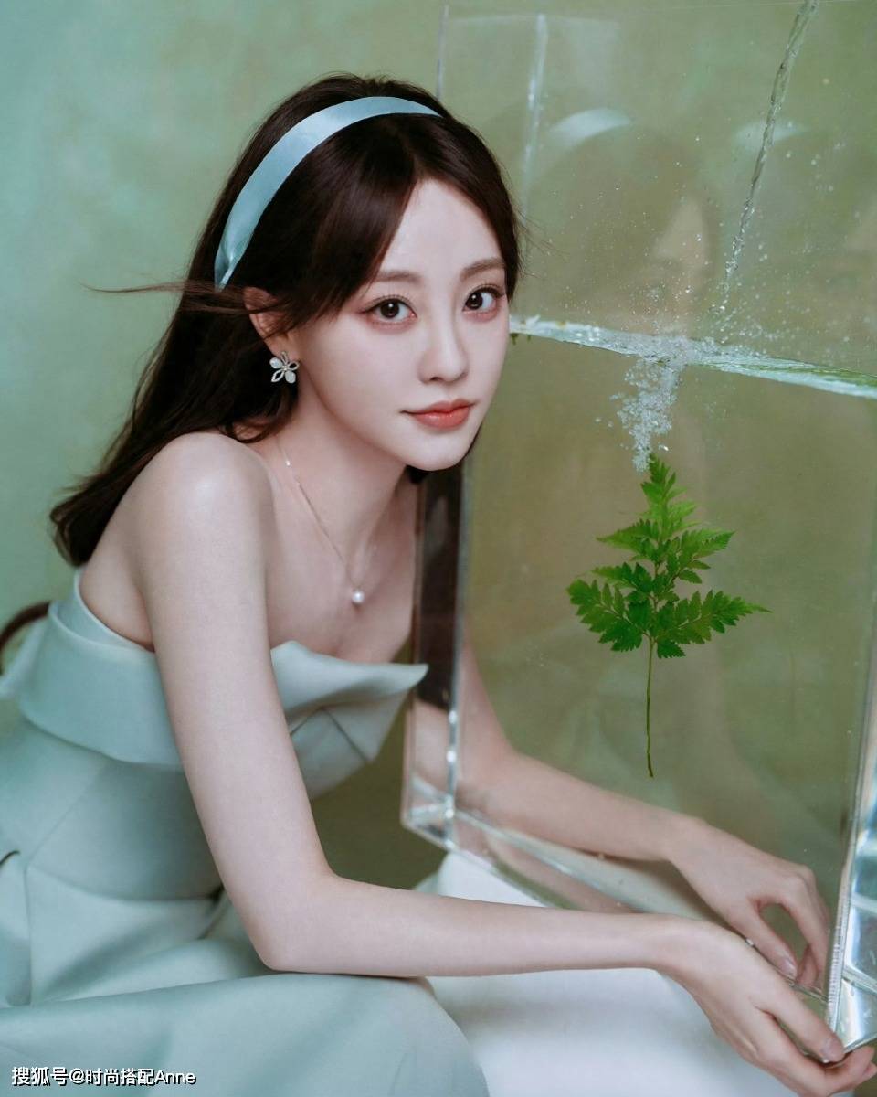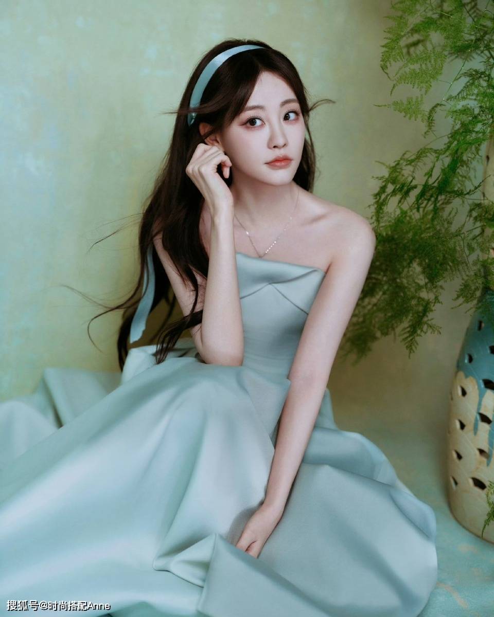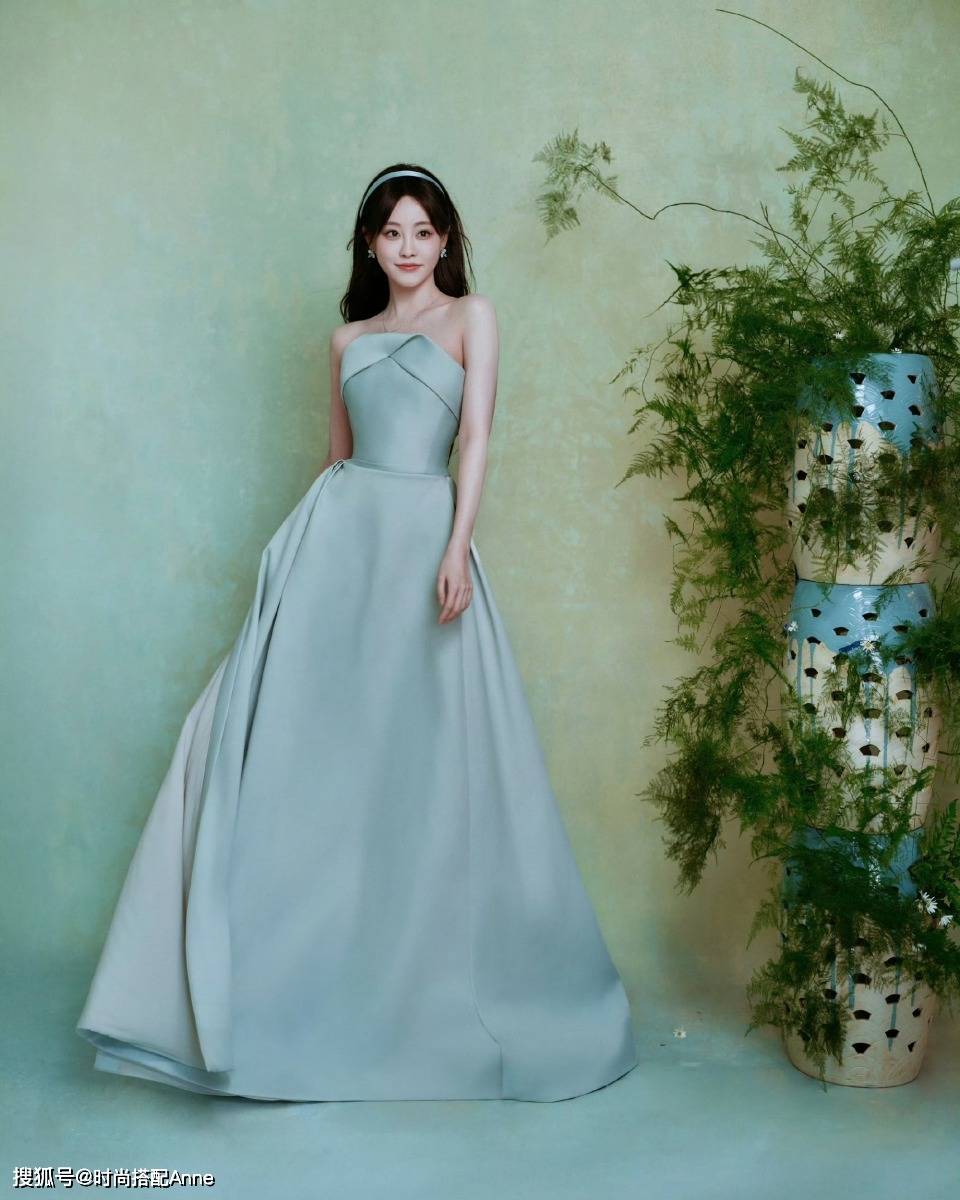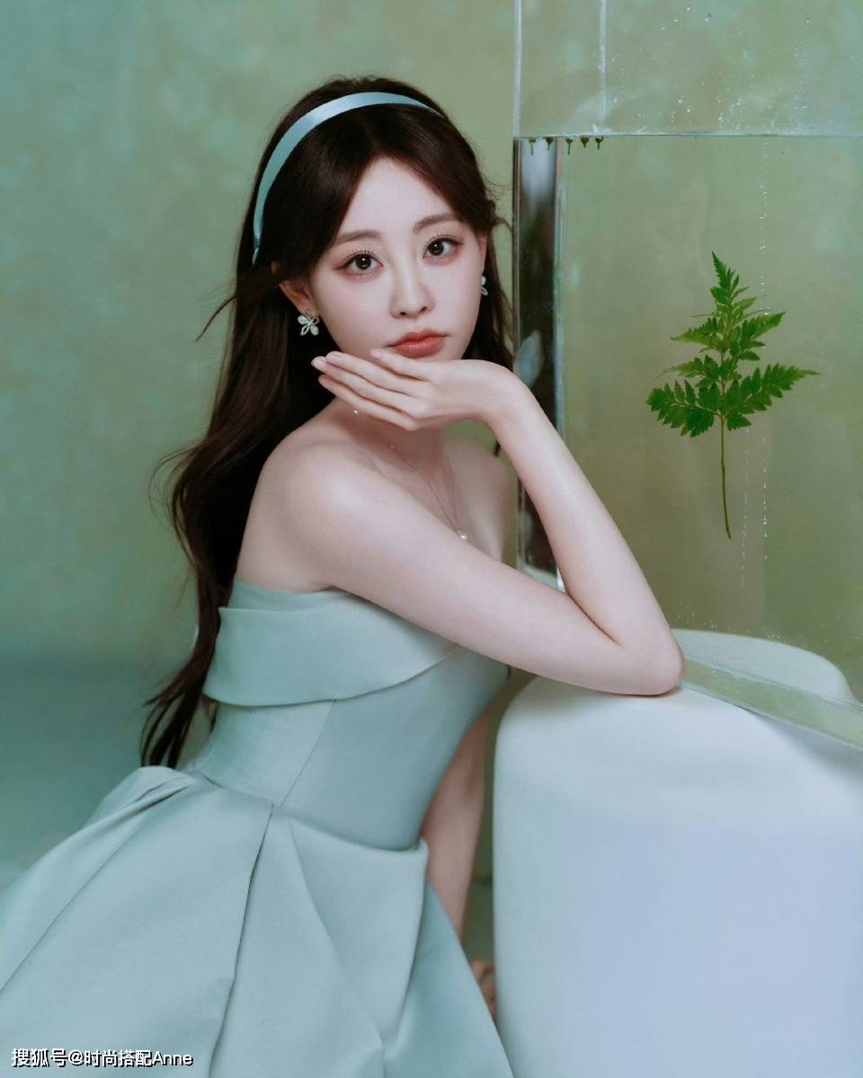祝绪丹身着一袭淡绿色抹胸裙,仿佛春日里最柔嫩的新叶。同色系发带巧妙地束起她的长发,露出精致的侧脸线条。她颈间那颗简约的珍珠项链——不多不少,恰到好处地点亮了整个造型。这一刻,她不仅仅是演员祝绪丹,更像是从森林深处走出的精灵,与自然元素和谐共生。她的美不张扬,却让人过目难忘。