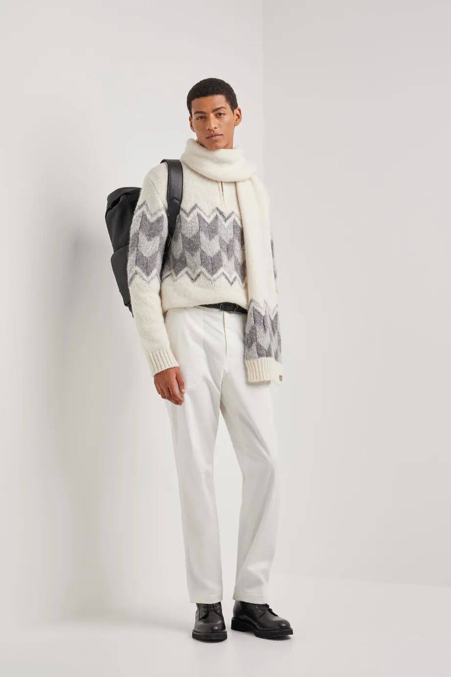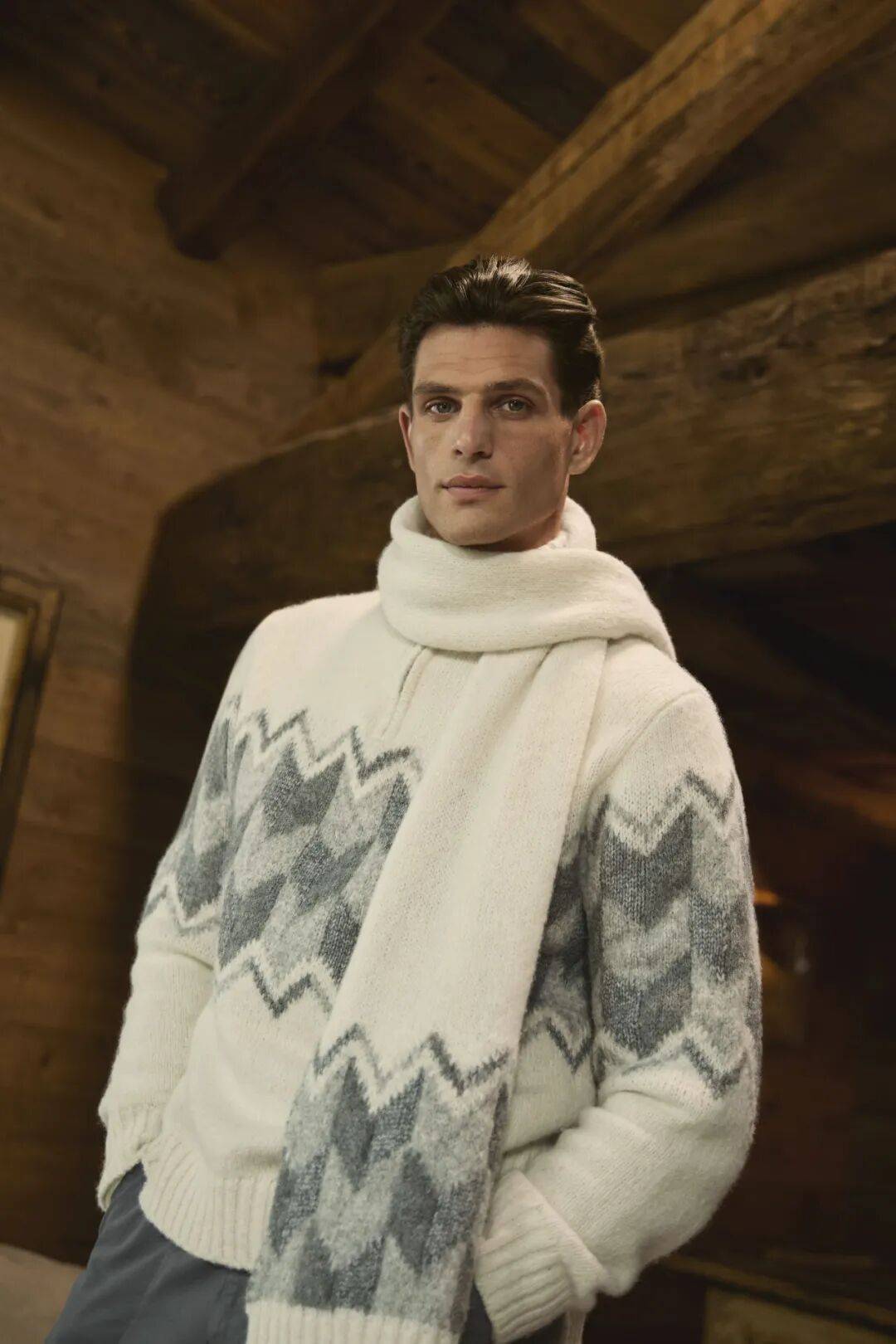 CANALI特别推出的Chalet胶囊系列将精湛制衣工艺与舒适面料巧妙相融,致献冬季山居生活的恬淡雅趣与温暖格调。例如,羊驼毛混纺半拉链立领毛衣,搭配饰有灰调“Freccia”箭头图案的奶白色围巾与白色奇诺裤,可谓亦庄亦谐,相得益彰。