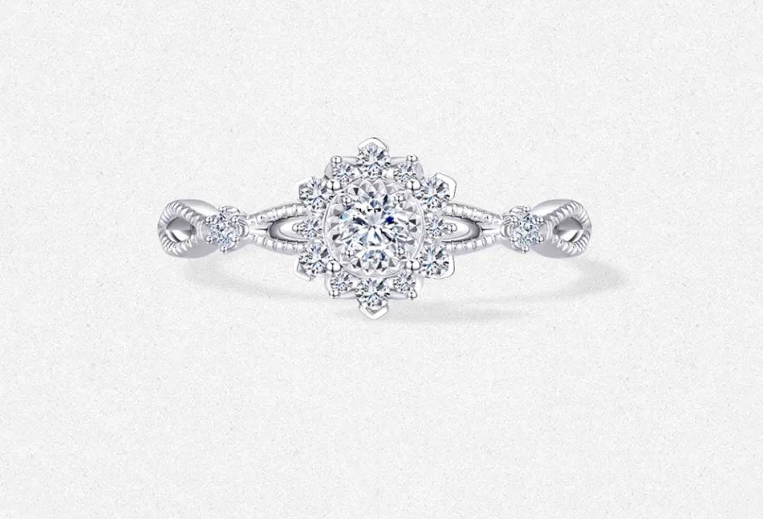 周大生初雪系列中的这枚天然钻石戒指能明显看得出雪花的形状,小体量钻石的应用也能展现出雪花在阳光下闪烁的氛围,或者让人想到一些用于圣诞节装饰的雪花灯饰。
