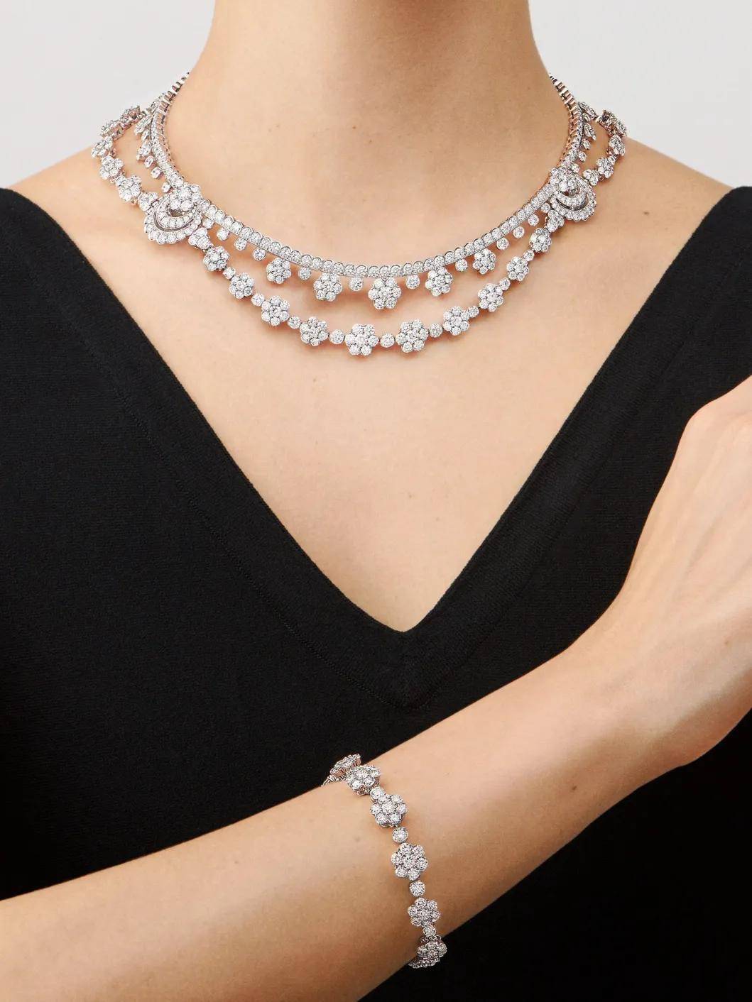 简约优雅的轮廓,涵盖圆形切割、水滴形切割、梨形切割等不同切割工艺的天然钻石,项链形态参照了花朵和叶片,经过层层叠加最终形成了花环形状,立体而富有层次,视觉效果拉满,这大概是华丽圣诞夜最闪耀的打开方式了。
