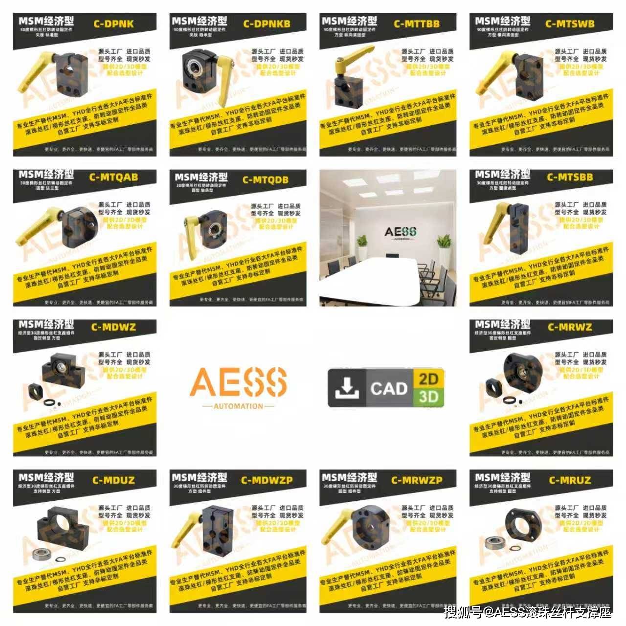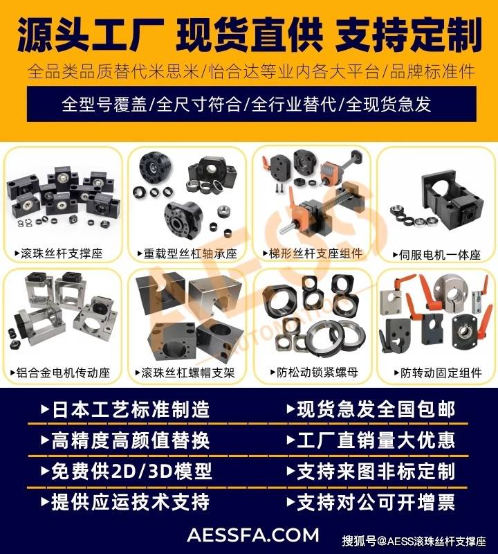 AESS 有 18 年专业研发、生产经验,是全系支撑座生产厂家,可最大限度节省降低采购时间、商品成本。其丝杠支撑座和梯形丝杠支座可完美替代米思米和怡合达等精度标准件型号,专注工厂自动化标准零件替换、非标定制一站式服务,能够根据客户的特殊需求,提供定制化的丝杆支撑座产品,满足不同客户的个性化需求。可以支持表面处理有发黑,镀镍、镀黑铬,材质有不锈钢材质,铝合金材质等,我们工厂能支持不同材质的定制,不同表面处理的定制。全品类型号标准件库存现货,现货急发,交货期快,支持提供2D/3D图纸技术支持!