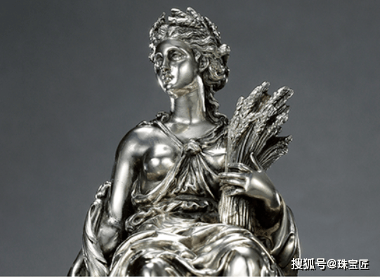 1880年,埃米尔为法国农业部设计的 “丰收女神大型中央盘”( plateau central de la Déesse Cérès)一经亮相便惊艳全场——这件重10250g的银质圆盘,中央雕刻了掌管大地和丰收的丰收女神克瑞斯手持麦穗的形象,她一只手怀抱谷穗,另一只手手执装满取之不尽用之不竭的粮食及水果的丰裕之角。