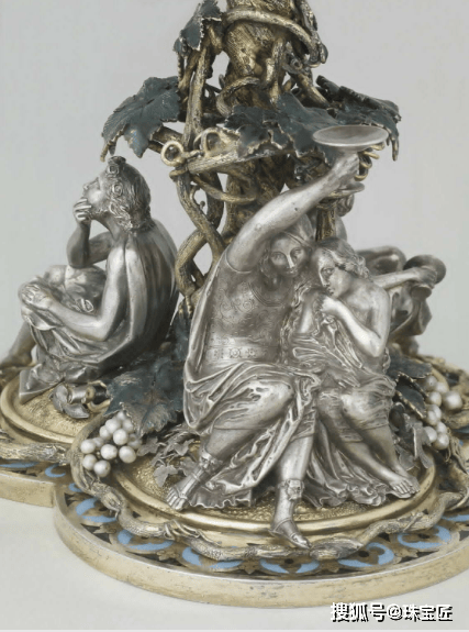 最有趣的是杯脚处的微型雕塑,刻画了三种“醉态”:象征“诗醉”的诗人阿那克里翁在沉思;一对文艺复兴装扮的恋人代表着“情醉”;而手拿酒杯的挪亚老人,则寓意着“酒醉”。