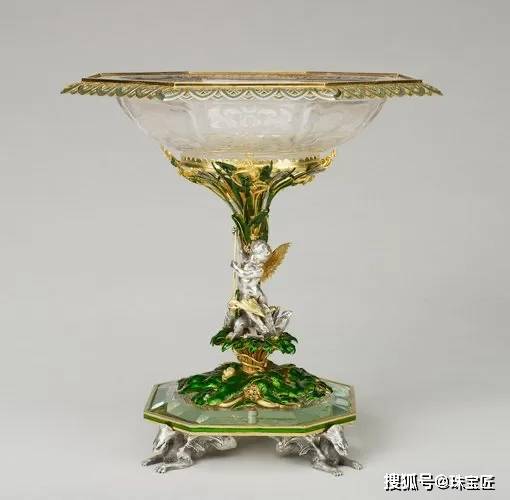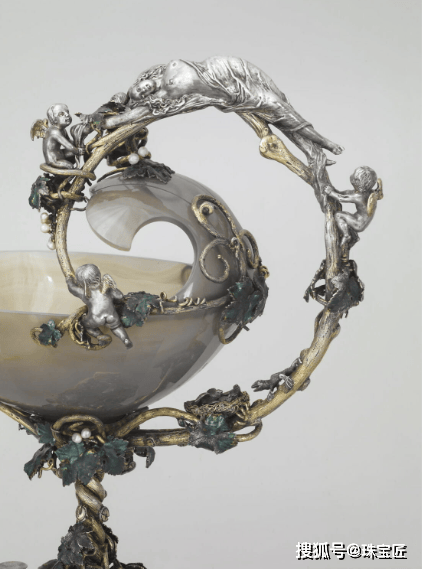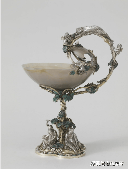 然而真正让这位金艺大师彻底迈入行业“顶流”的还是1844 年法国工业博览会上,他设计的 “Coupe des Vendanges丰收杯” 一举斩获金奖——这件现存于卢浮宫博物馆的作品,以玛瑙雕刻而成,杯子被安置在华美的镀金银座上,整个底座被做成了一株葡萄藤的模样。