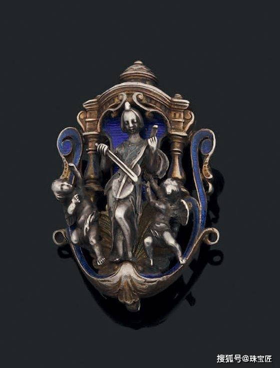 胸针上部是银雕的维纳斯像,从珐琅芦苇围着的大贝壳里浮现,旁边还有奏乐的天使和带翅膀的海妖。