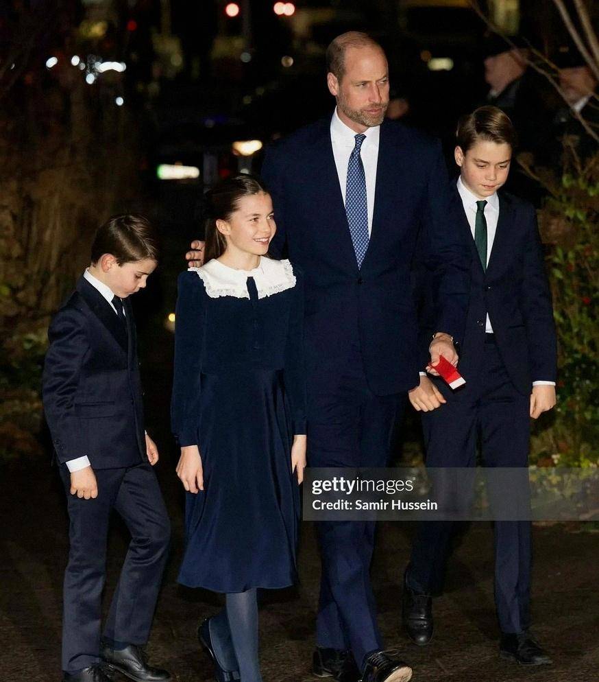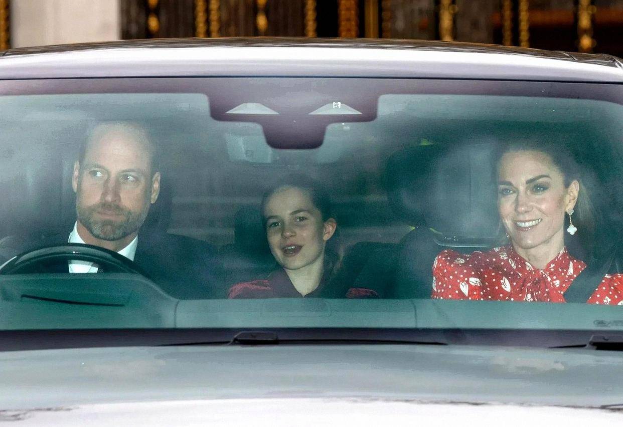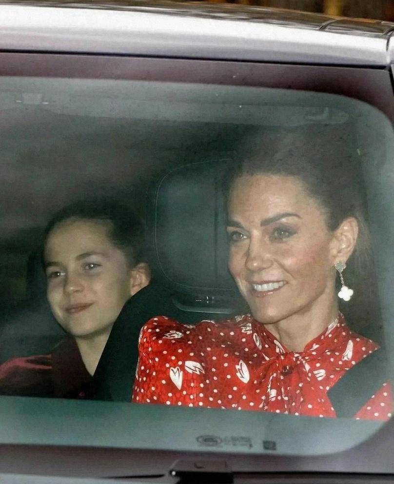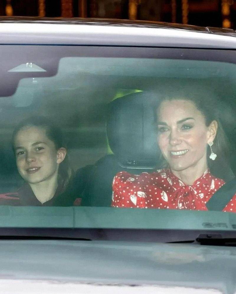 媒体镜头里,威廉亲自驾驶,凯特穿红色图案裙,夏洛特是酒红丝绒裙配同款发弓,视觉统一很考究,节日氛围瞬间拉满