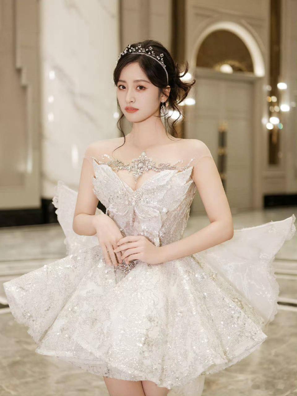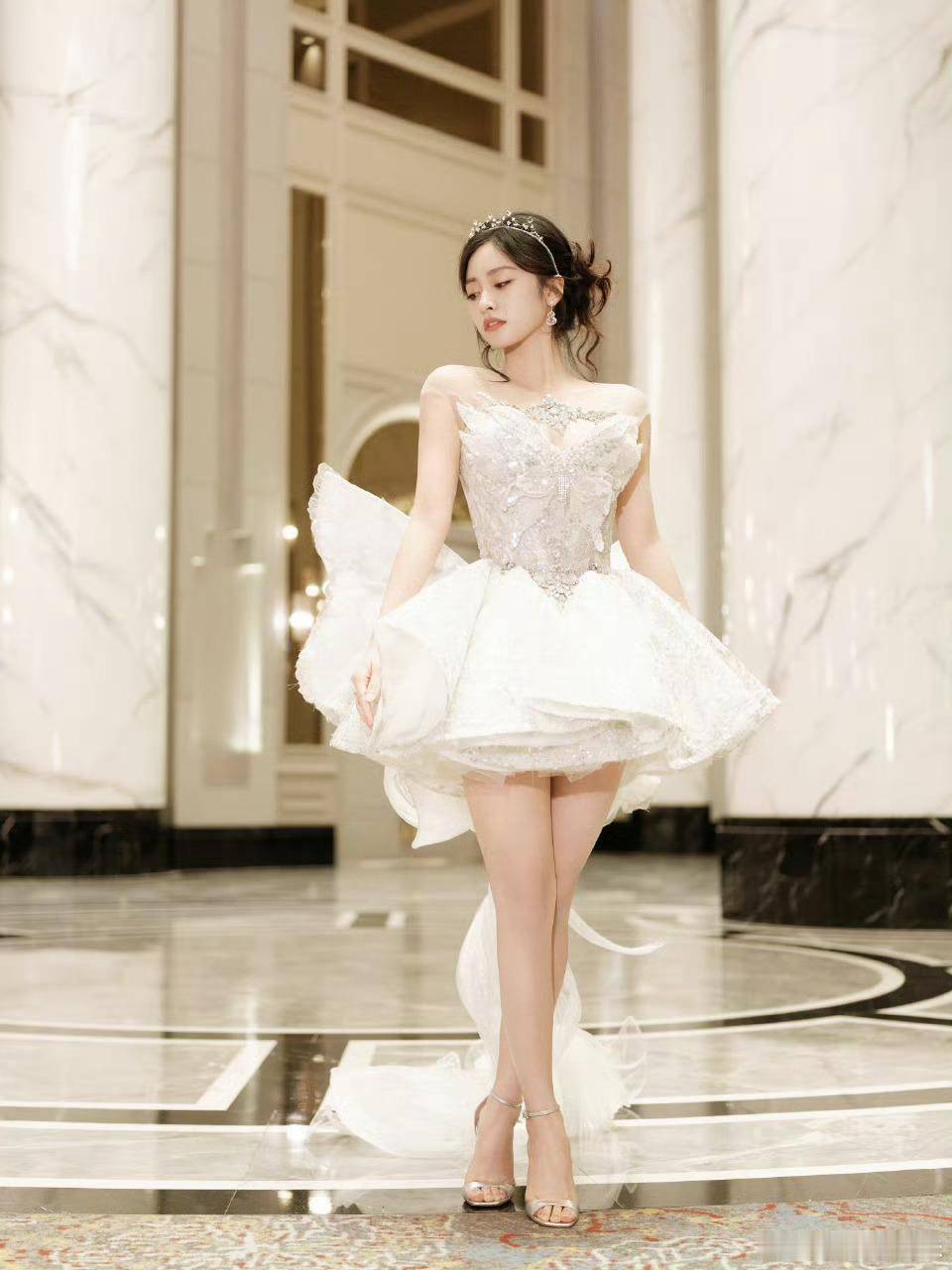 本次造型的核心关键词是“浪漫与灵动的共生”。整套look以纯净的白色为主色调,但却通过丰富的材质和设计避免了单调。露肩短款礼服的设计别出心裁,上半身的立体装饰华丽夺目,而下半身轻盈的薄纱裙摆则保证了动感,当她侧身而立或轻提裙摆时,宛如云朵拂过,仙气十足,将她轻盈的身姿衬托得愈发楚楚动人。