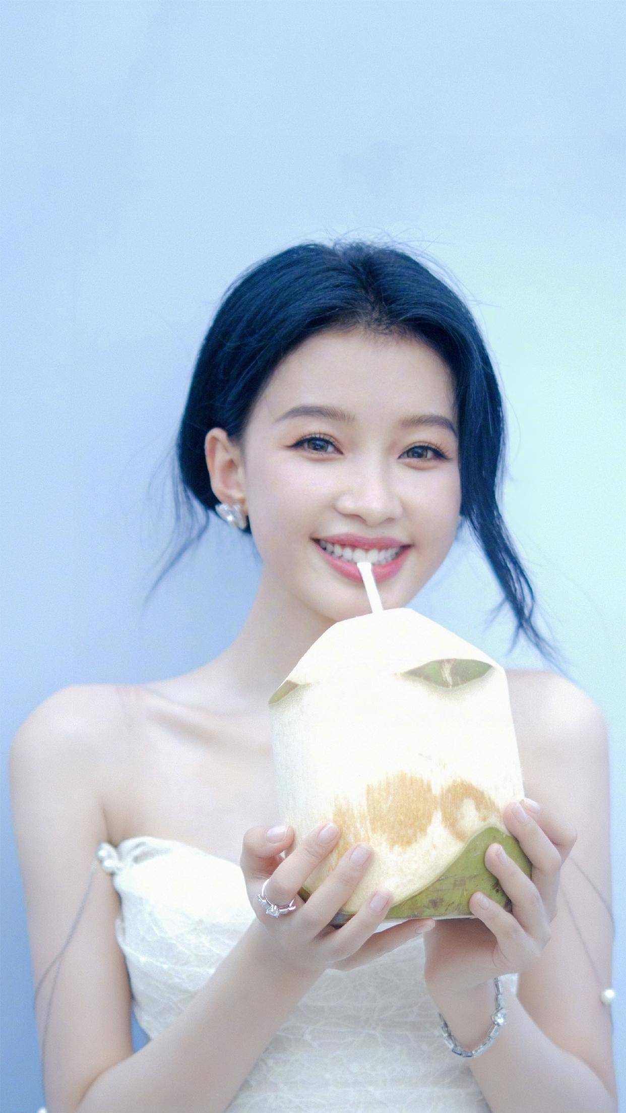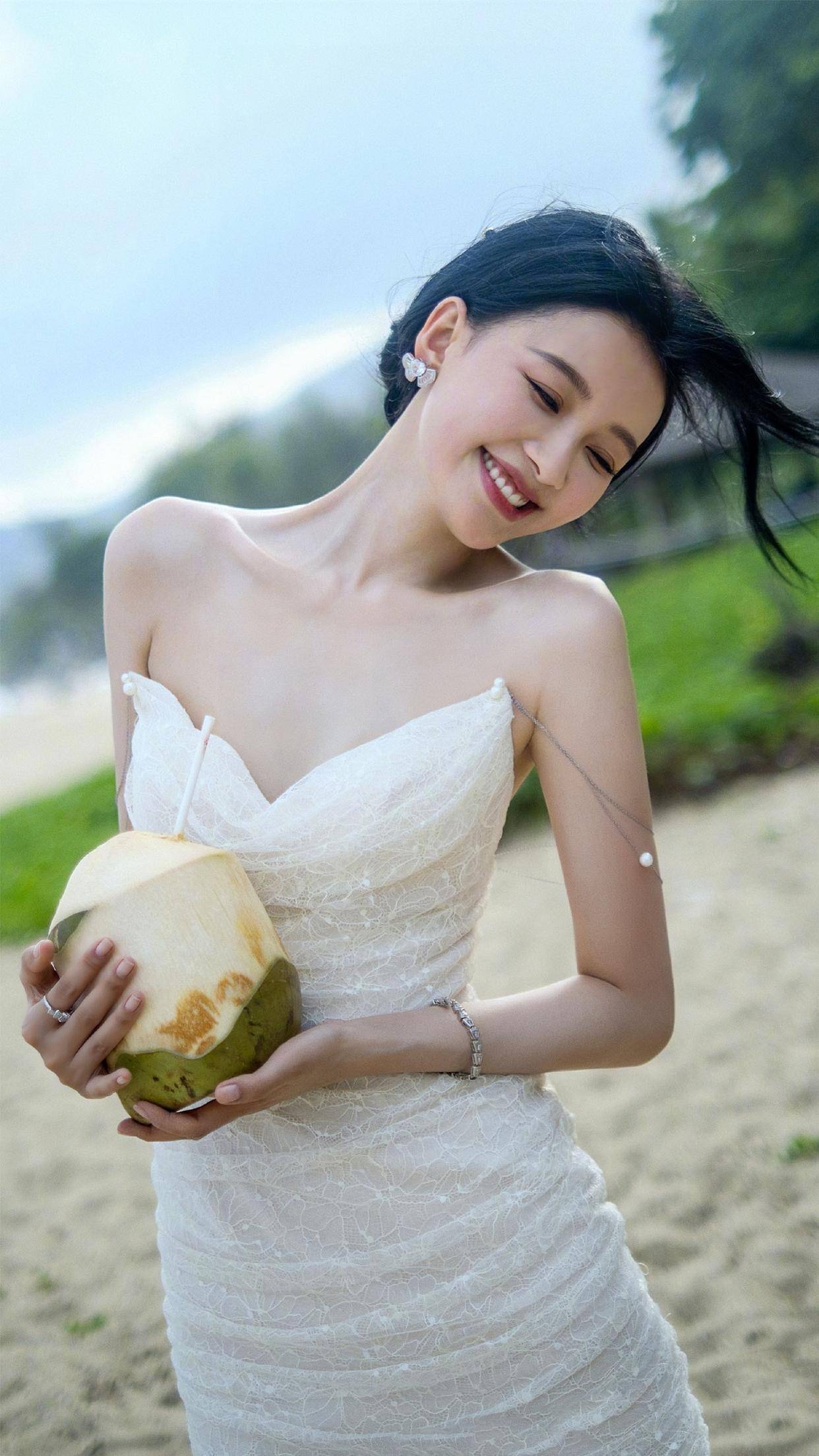 她的长发微卷,自然垂落肩头,与裙装的柔美风格相得益彰。妆容上,她选择了精致的妆容,强调眼部和唇部的妆容效果,使得整体造型更加生动迷人。在配饰方面,她佩戴了简约而精致的耳环和手链,为整体造型增添了一丝亮点,凸显了她的时尚敏感度。