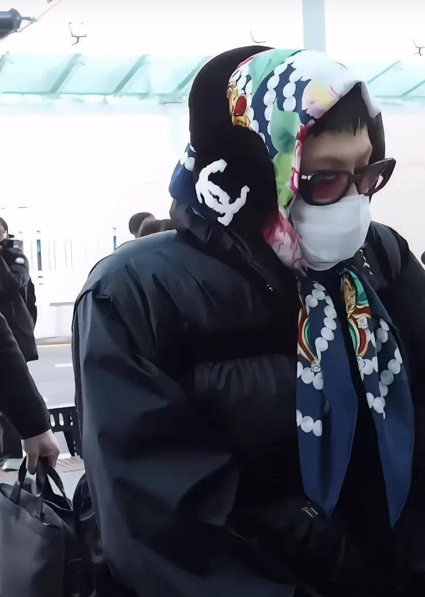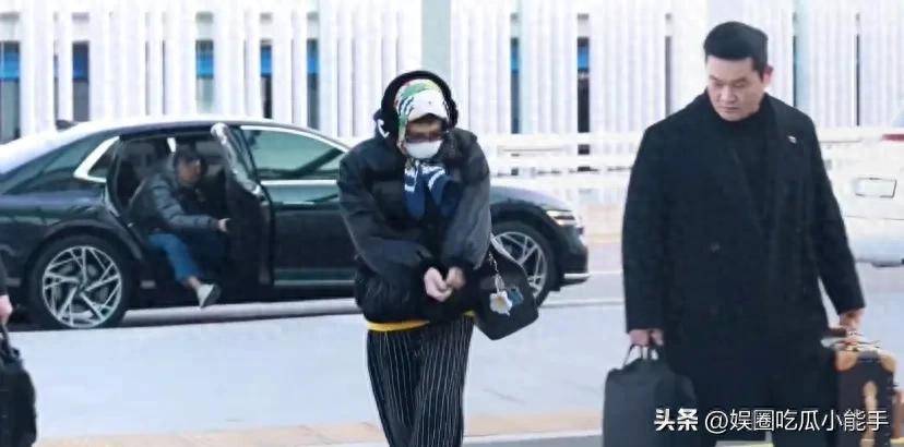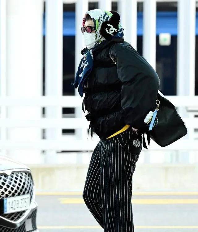 他身披黑色羽绒服,内搭马甲,粉彩墨镜与口罩掩不住那份独特气场。最引人注目的是他近年钟爱的丝巾——这次竟创意十足地缠绕成头巾,搭配条纹长裤与一抹亮眼的红鞋,整体造型既花哨又和谐,犹如一幅行走的现代艺术画。更有趣的是,头巾之上还叠加了香奈儿经典耳罩,仿佛在诉说冬日寒风与时尚态度间的微妙博弈。
