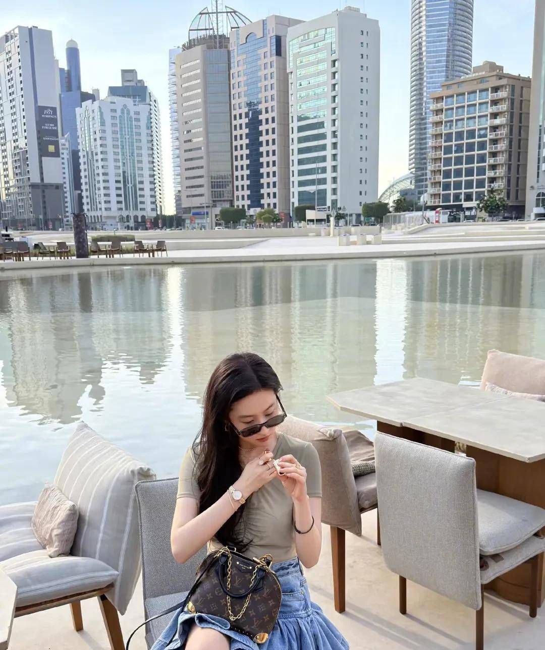 镜头下的她,一头长发如瀑倾泻,肩背LV经典包袋,身着灰绿色露脐上衣,搭配牛仔半裙,简约之中透出几分随性自在。
