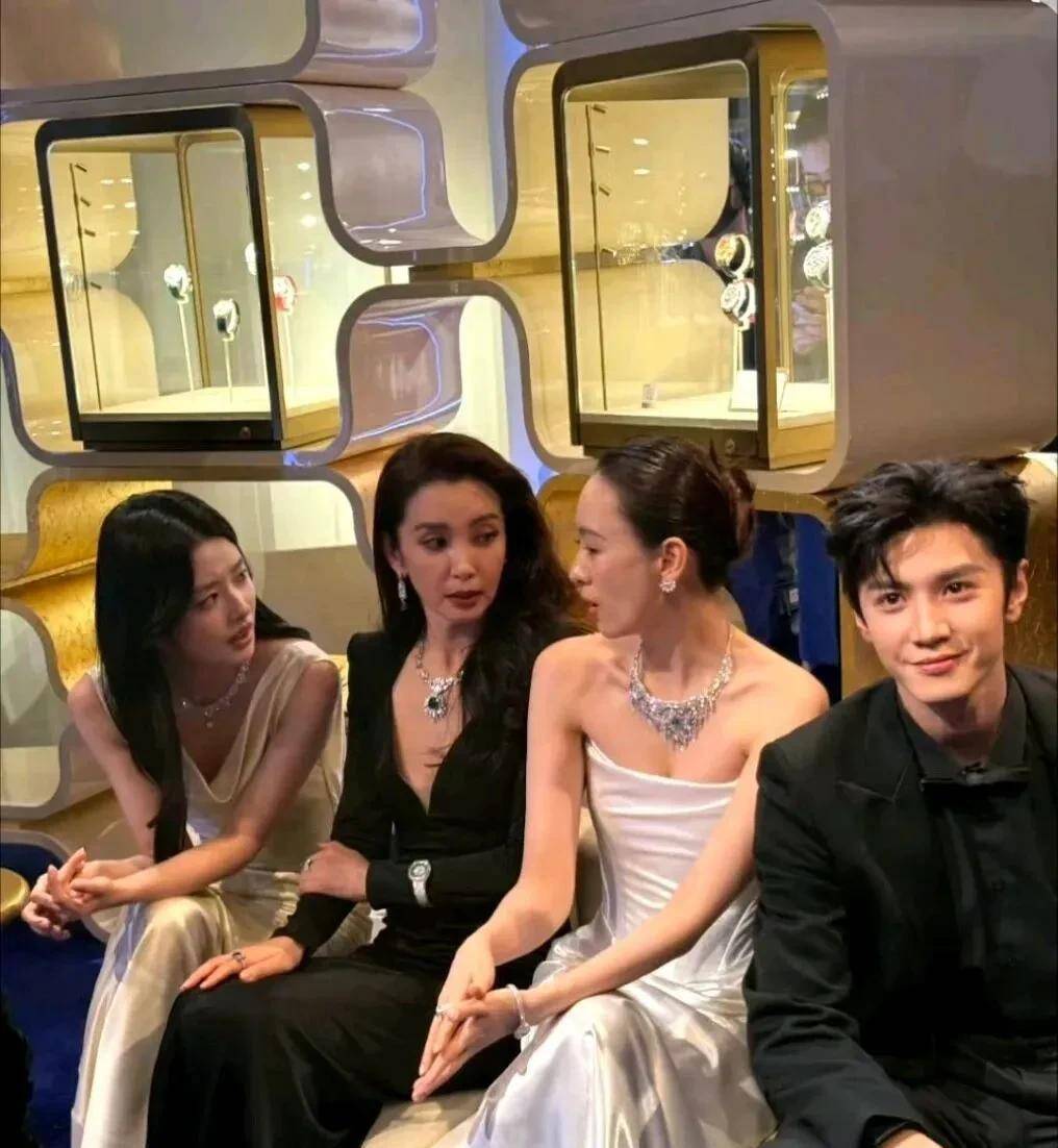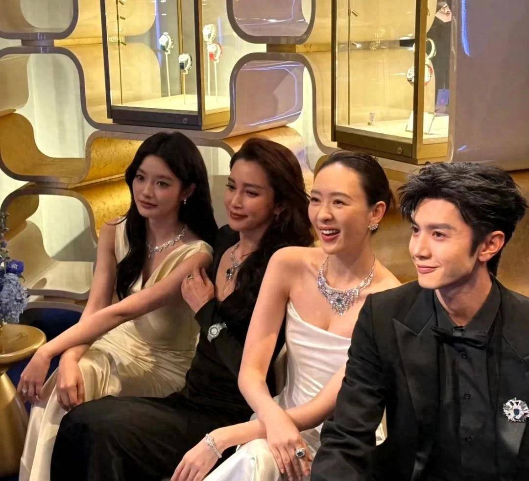 先说说最让人惊艳的“豪门姐弟”名场面。当天晚宴上,李冰冰、童瑶、徐若晗并排坐在主桌热聊,陈哲远则坐在童瑶身侧,四人随后一同登台举杯共饮香槟,画面和谐又养眼。