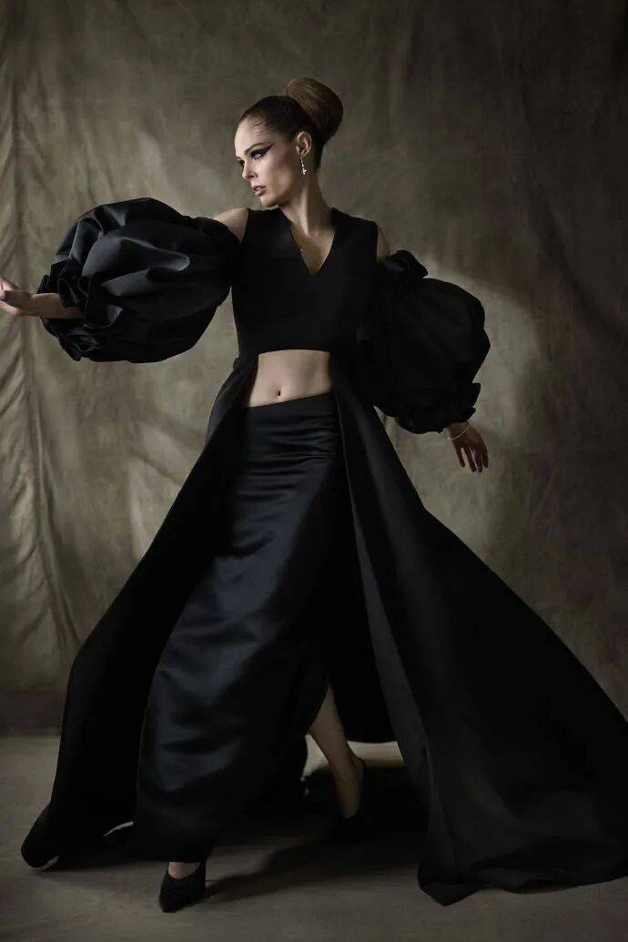 系列以一件饰有超大珍珠的无肩带黑色礼服裙开场,搭配可选的戏剧化歌剧长手套,瞬间将观众带入一个兼具古典与摩登的世界。虽然系列色调沉稳,黑色占据主导——这正是向常穿黑色的缪斯丽莎致敬——但设计师通过出色的面料肌理与标志性剪影赢得了注目。