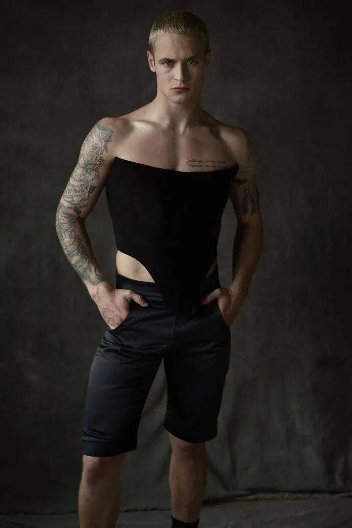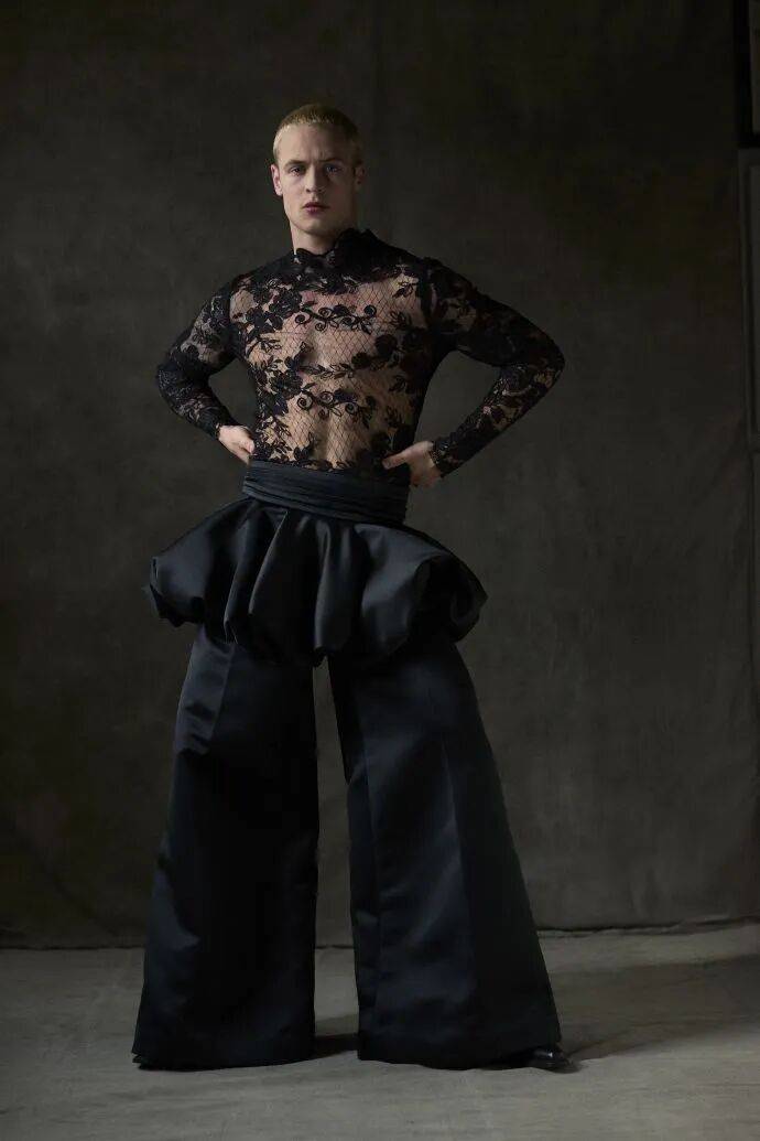 男装线以“好莱坞冒险家”为主题掀起革命。半透黑蕾丝上衣若隐若现地勾勒肌肉线条,自带斗篷的白色燕尾服打破性别桎梏,用解构手法重塑传统晚礼服的庄重感。“我们需要去除沉闷!”Siriano强调。这些设计仿佛佩恩镜头中那些打破常规的男性肖像,在优雅中注入一丝危险的浪漫。