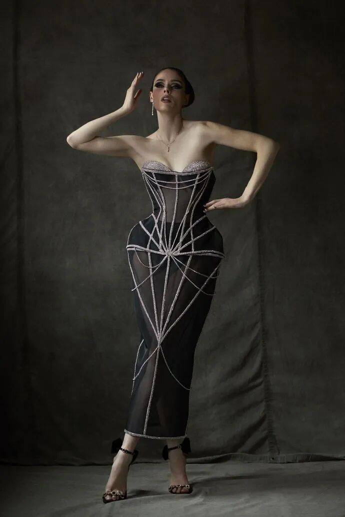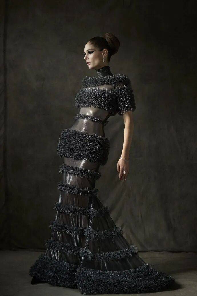 系列以复古廓形为骨架,大量单品溯源至品牌档案库中的经典设计:无肩带黑色礼服缀满超大珍珠,如佩恩镜头下丽莎的冷冽锋芒;金属枪色薄纱礼服以层叠褶皱塑造立体雕塑感,再现上世纪中期的高定时装语言。即便色彩以沉稳的黑色为主调,细腻的面料肌理与建筑感剪裁仍让每件作品成为行走的艺术品。