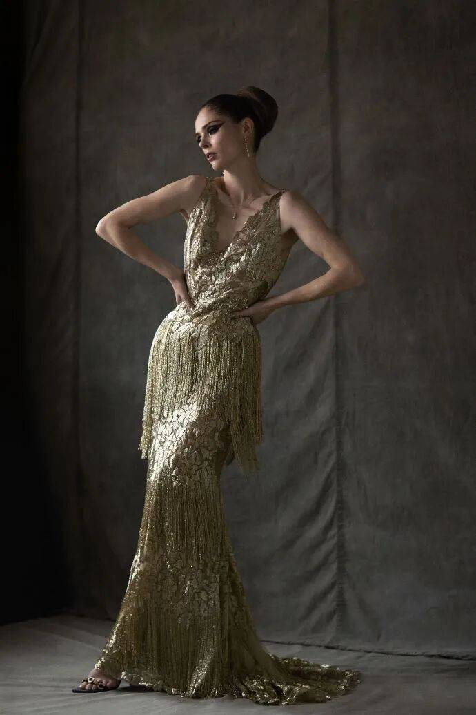 为适配多元场景,Siriano大胆重构传统礼服逻辑。戏剧化的歌剧长手套缀满巨型荷叶边,却作为可选项存在;层叠蓬蓬裙化身两件套组合,让“公主裙”不再受限于盛大场合。一件金色亮片外套搭配缎面阔腿裤,既保留晚装的华丽基因,又赋予日间活动的可能性——正如丽莎在镜头内外自如切换的巨星风范。