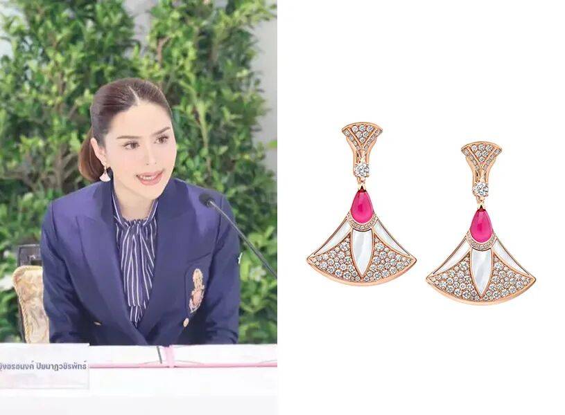 之前还穿过一件学院风的蓝西装,搭配条纹飘带领衬衫,戴30万+宝格丽diva's dream系列耳环,吸睛度拉满~
