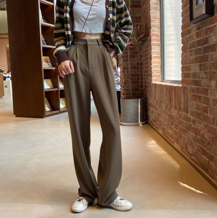 3.棕色裤子+同色上衣同色搭配非常风和谐和别致,比如一件卡其色和白色条纹衫搭配棕色裤子,再搭配一双白色浅口高跟鞋,整个造型充满白色和棕色呼应的旋律感,很有让人耳目一新的清新气质。