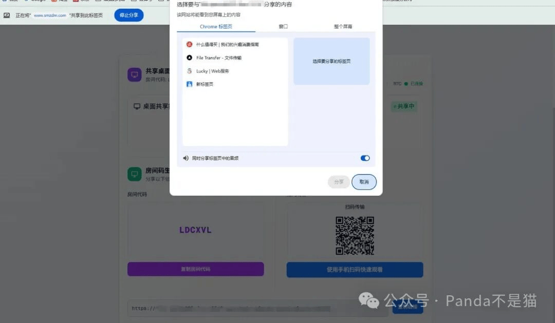 最后则是桌面共享,在创建好房间之后可以对要分享的桌面进行选择,支持网页的标签页、窗口以及整个屏幕进行共享。