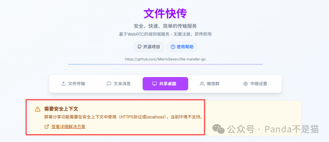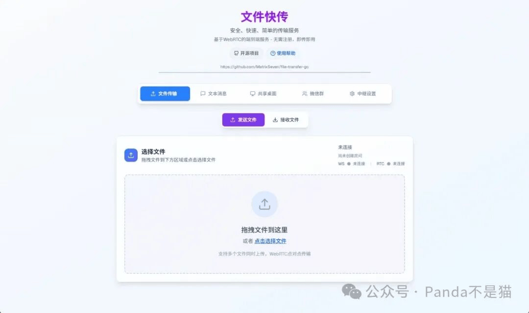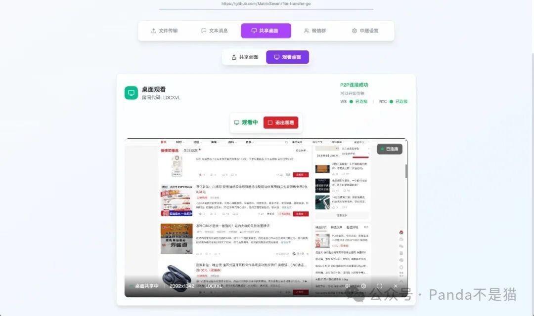 前阵子看到个超优秀的开源项目,能实现文件、文本的点对点和点对多传输,还支持桌面共享。因为传输是基于 WebRTC,所以它不挑设备和平台,而且页面自适应做得相当好。