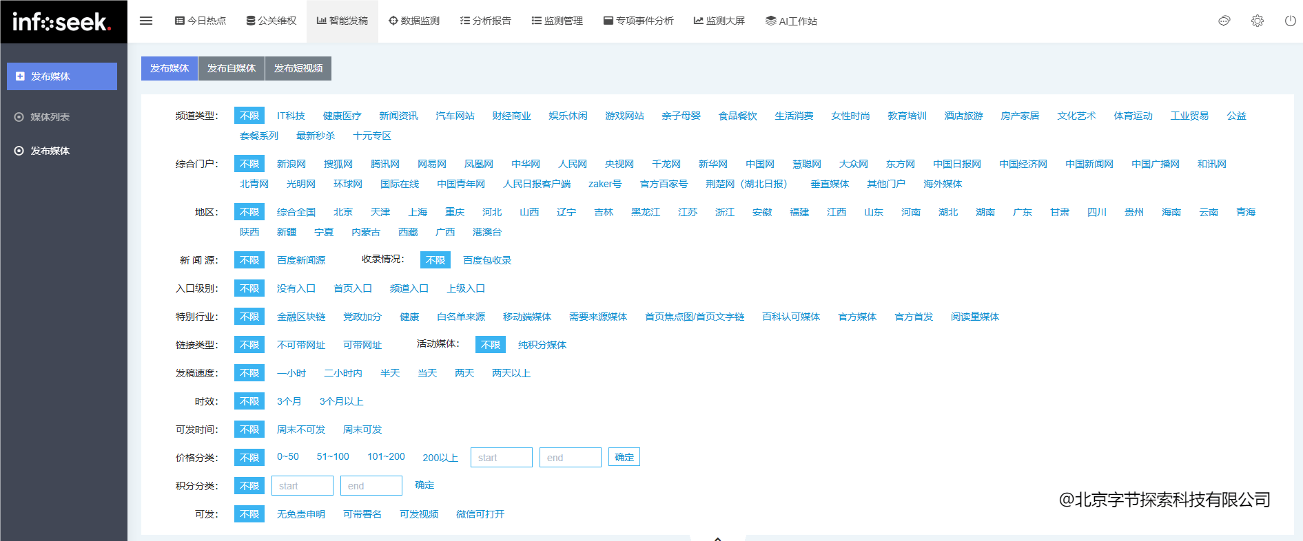 以前做舆情监测,大多是人工刷平台、搜关键词,不仅看得范围窄,人还容易累,漏消息是常有的事。但 Infoseek 舆情监测系统就像在数字世界里布了张全方位的大网,7×24 小时不停歇地扫描新闻网站、社交平台、论坛、短视频这些地方,足足覆盖 8000 多万个信息源,不管是热门大平台,还是小众角落,都能盯得明明白白。