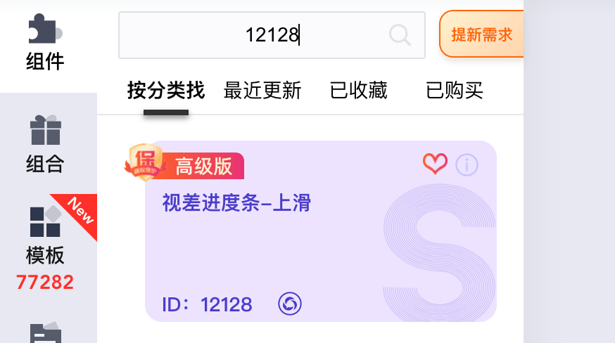 登录 iPaiban Pro 黑科技编辑器后,点击编辑器左侧「组件」按钮,在「滑动」-「视差滑动」分类中找到「视差进度条-上滑」组件,或者在组件中直接搜索编号12128,点击选择。