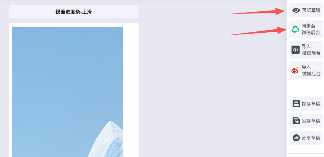 点击最右侧「预览草稿」可随时扫码预览效果,效果满意后点击「同步至微信后台」同步到自己的公众号就可以了。