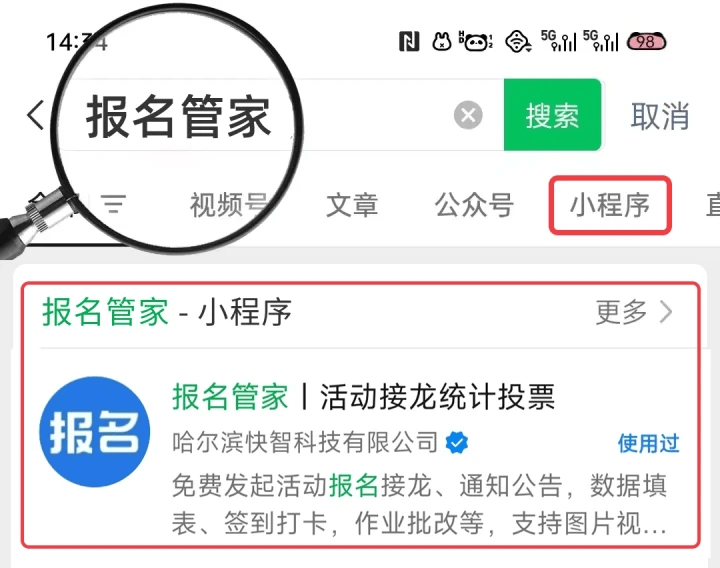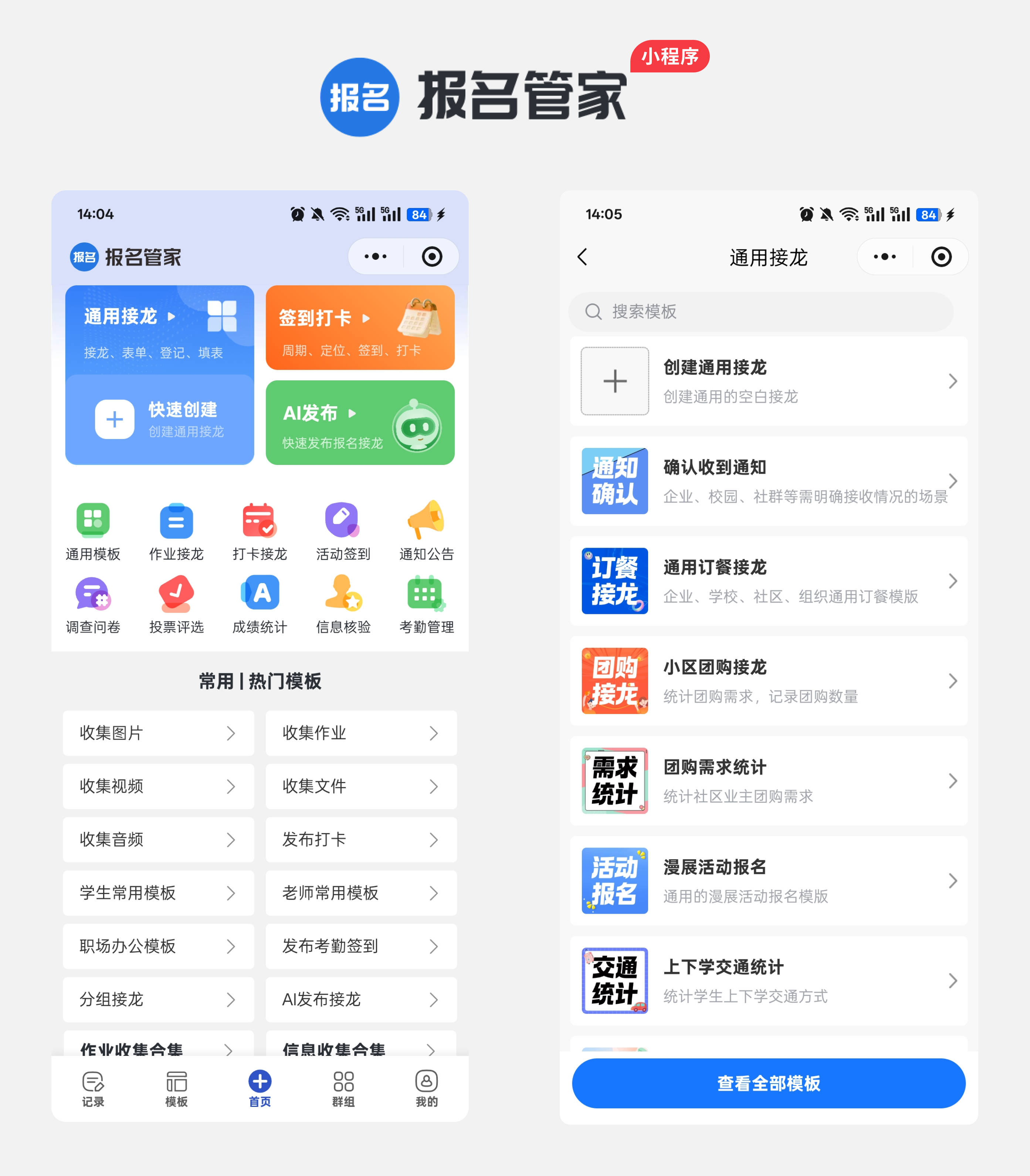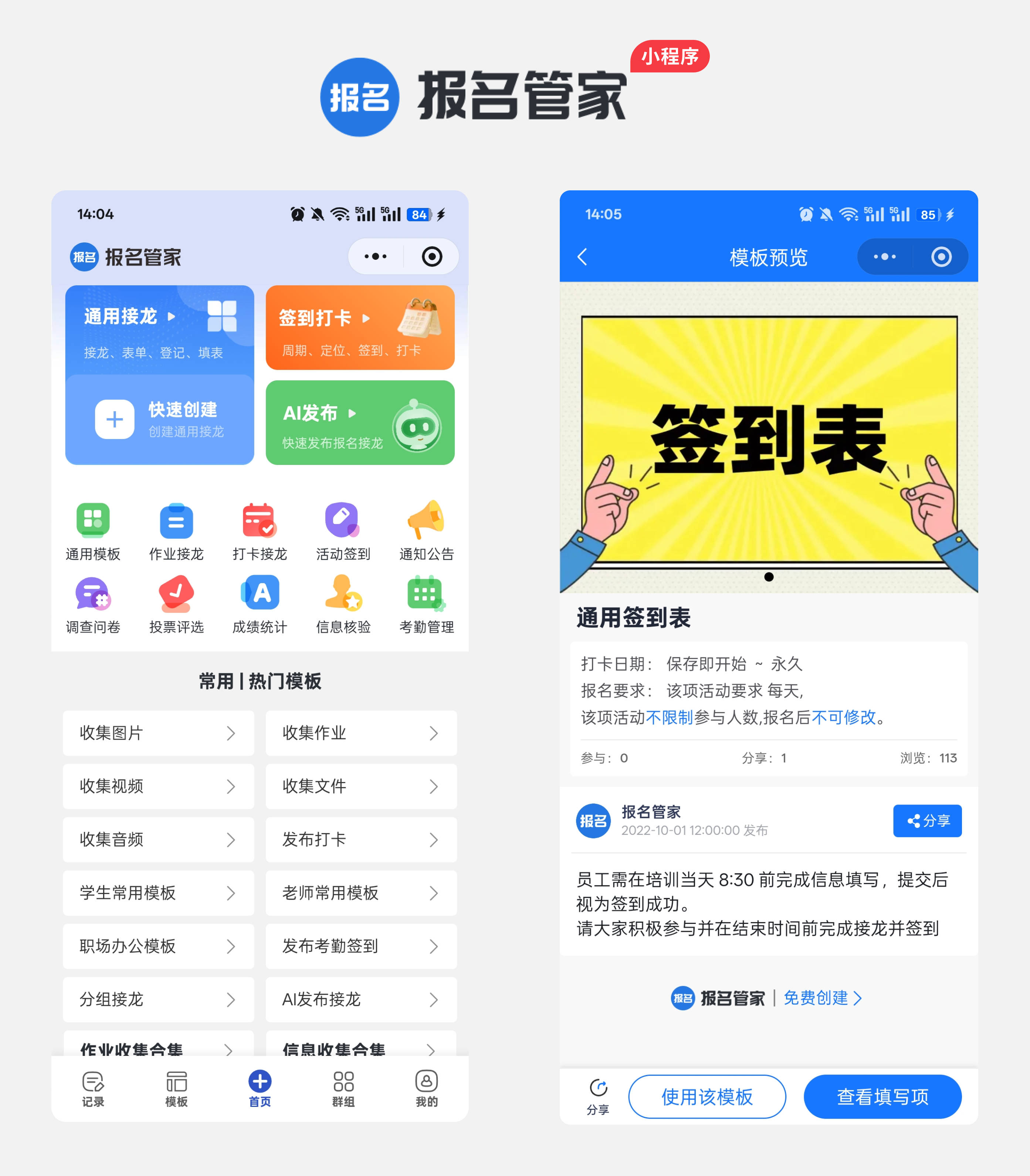 - 打开“报名管家”小程序,创建签到打卡活动。