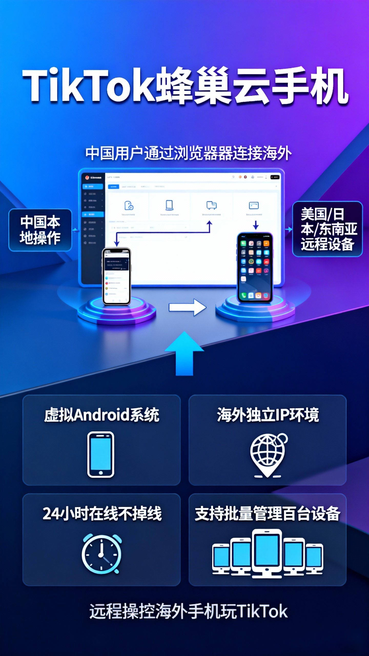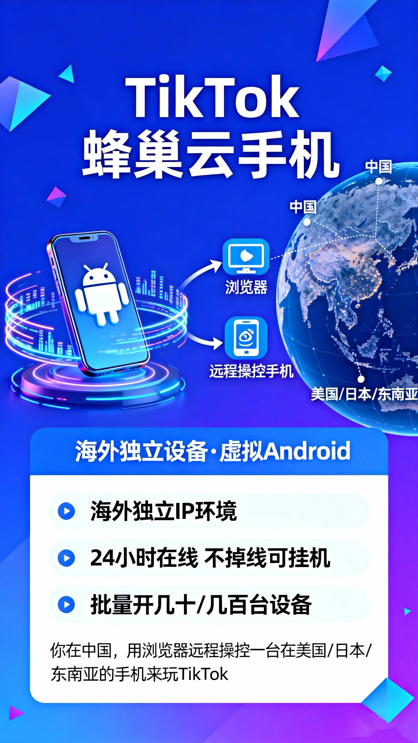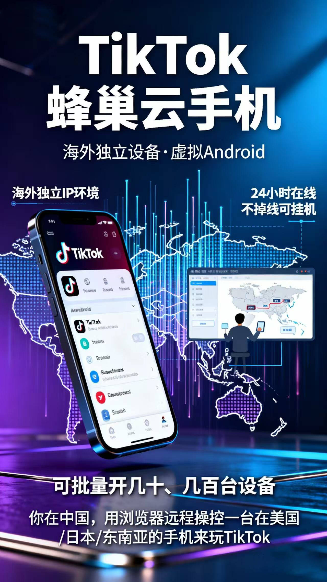 TikTok 云手机=海外独立设备(虚拟 Android)、海外独立 IP 环境、 24小时在线,不掉线可挂机、可批量开几十、几百台设备。可以把它理解成:“你在中国,用浏览器远程操控一台在美国/日本/东南亚的手机来玩 TikTok。”