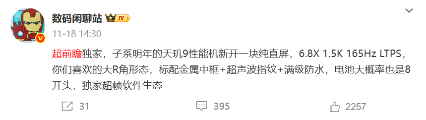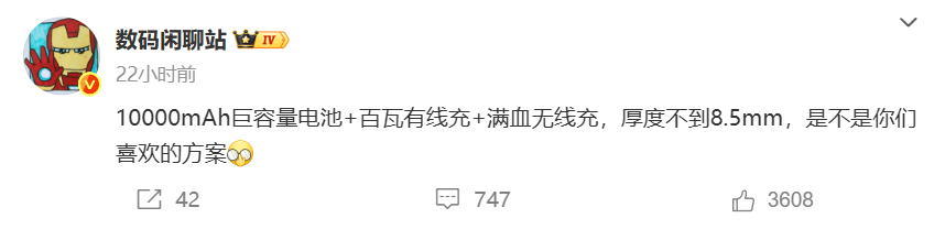 红米有一款机型就值得期待,那就是红米k90至尊版,近期博主数码闲聊站再次爆料了这款手机,据了解这款手机会给到10000mAh巨容量电池,并支持百瓦快充和满血无线充电,续航方面是真不错啊,尤其是厚度还能够控制在8.5mm以内,拿起来不会特别厚,手感还过得去,这应该是大众非常喜欢的方案了吧!