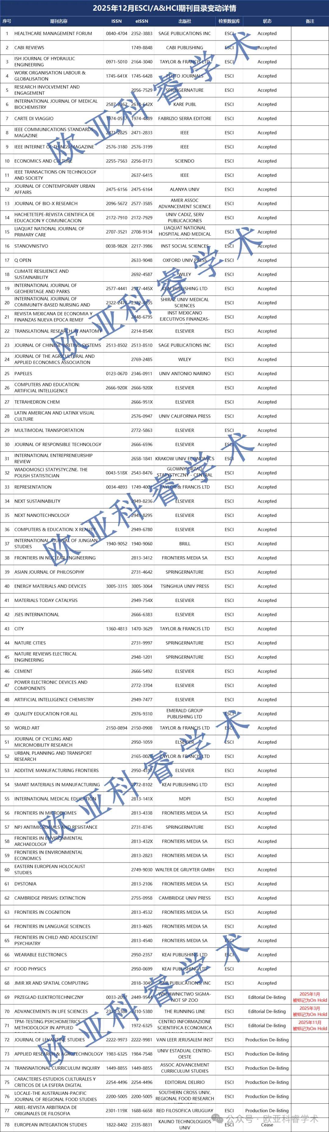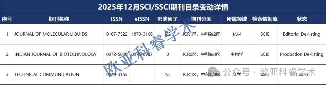 2025年12月15日,科睿唯安本年度第十二次更新Web of Science核心期刊目录。与上次更新相比,本期SCI/SSCI目录共3本期刊发生变动,ESCI/AHCI目录共78本期刊发生变动,详情如下: