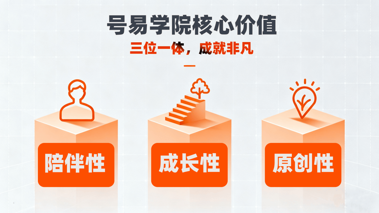 这种赋能理念,在“号易学院”的价值体系中得到进一步深化(如学院核心价值图所示)。其所强调的“陪伴性、成长性、原创性”,标志着平台对从业者的支持已从单纯的产品供给,上升至知识赋能、技能培训和长期陪伴的系统性支持,旨在培养行业的正规军,推动整个生态向着更专业、更规范的方向发展。