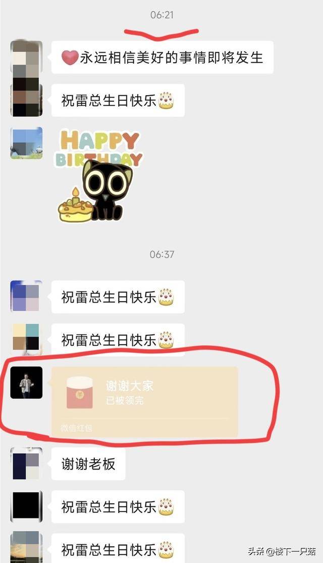 有自媒体博主晒出几张聊天截图,截图中显示,自媒体群内有人发言祝雷军生日快乐,十几分钟后雷军表示感谢,并在群内发起了红包。群内聊天时间显示是早上的六点半左右,这个时候的雷军就已经起床,属实是很自律了。
