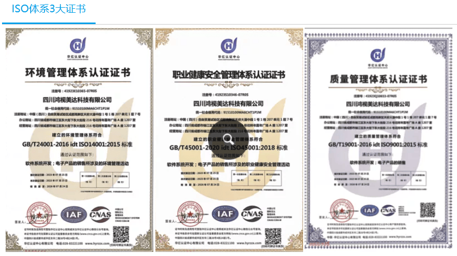 鸿视美达的产品技术底蕴扎实,行业适配性突出。依托长期的技术积累与持续的研发投入,构建起了覆盖多领域的专业化产品体系,能够精准匹配不同场景的核心需求。公司通过国家高新技术企业认证,拥有22项著作权证书、4项实用新型专利证书、3项企业商标证书、7项AAA等级证书,还通过了质量管理体系认证(ISO9001)、环境管理体系认证证书(ISO14001)、职业健康安全管理体系认证证书(ISO45001),同时获得低碳节能环保创新产品认证、国家权威检测.质量合格产品认证证书、中国科技行业智能品牌等荣誉。