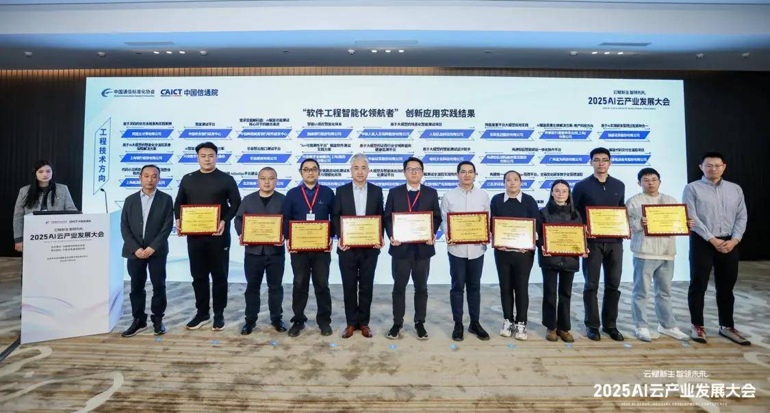 12月12日,由中国通信标准化协会主办、中国信息通信研究院(以下简称“中国信通院”)承办的2025 AI云产业发展大会在北京盛大召开。本次大会不仅是云计算与人工智能融合发展的风向标,更是检验年度技术落地成果的重要平台。在备受瞩目的全栈全能智算云分论坛上,云计算标准和开源推进委员会正式公布了2025年“软件工程智能化领航者”创新应用实践结果。