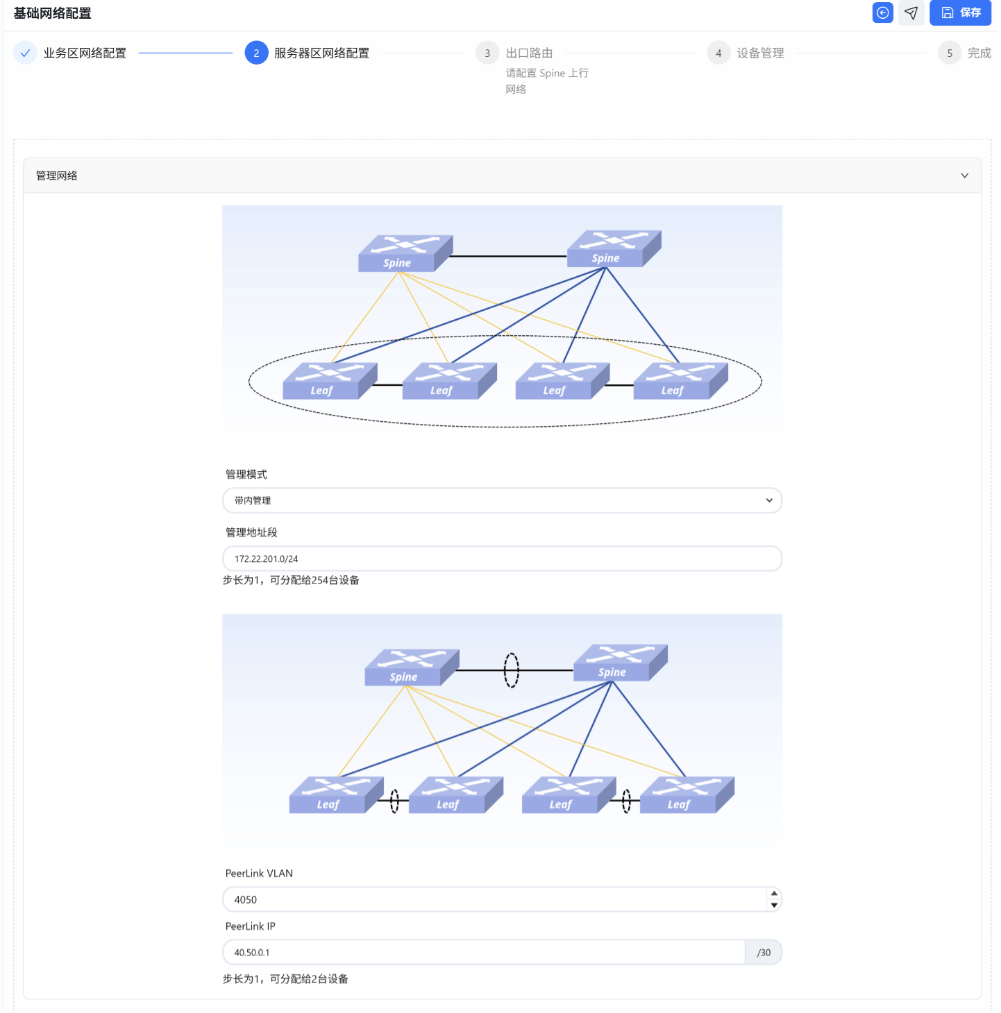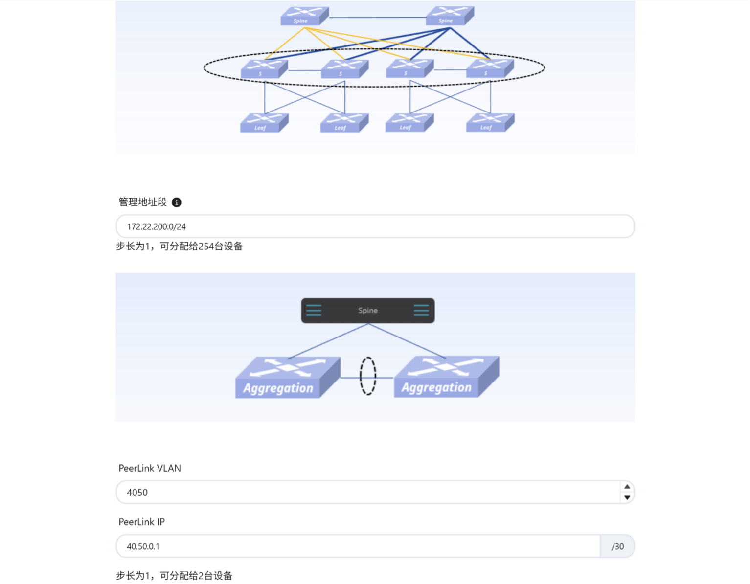 按角色(Spine/Aggregation/Leaf)分配设备并填写互联接口,控制器会根据填写内容生成网络拓扑。