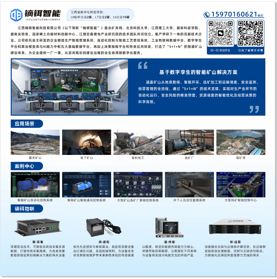 江西镝铒智能科技有限公司是由矿库网、北京科技大学、江西理工大学、赣南科技学院、赣南实验室、国家稀土功能材料创新中心、江理宜春锂电产业研究院的技术团队共同创立,集产学研于一体的高新技术企业。公司依托自主研发的企业精益生产智能管理系统、自动化控制与智能工艺管控系统、工业物联网数据中台,数字孪生平台和算法模型库与AI能力中枢五大基础数据平台,再加上决策指挥平台和各类数字化应用场景,打造了"5+1+N”的智能工厂建设体系为企业提供一厂一策,涵盖咨询规划、实施运维,数据分析及系统升级等全方位服务。以稀土产业链领域为例,业务贯穿稀土矿山开采、冶炼加工、新材料制造全产业链,推动矿山行业从粗放式开采向资源精细化利用转变,冶炼行业从高能耗模式向智能低碳生产转型,新材料加工行业从依赖经验驱动的研发向数据驱动研发迈进。