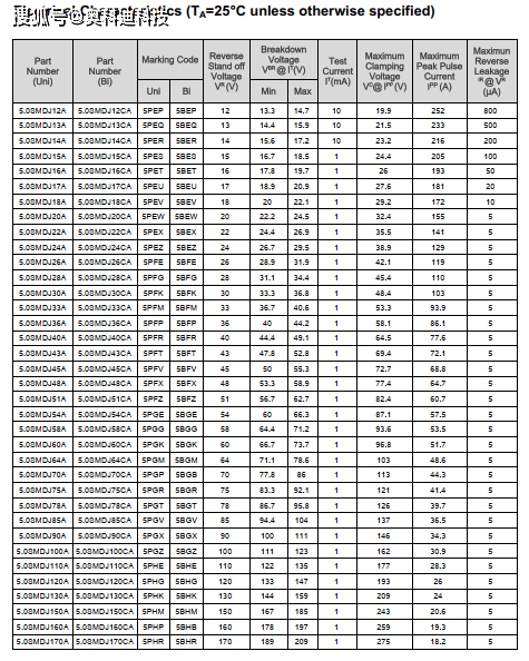 5.0SMDJ系列瞬态电压抑制器是出色的过电压保护装置。该系列专为保护敏感电子设备免受雷击和其他瞬态电压事件引起的电压瞬变而设计。
