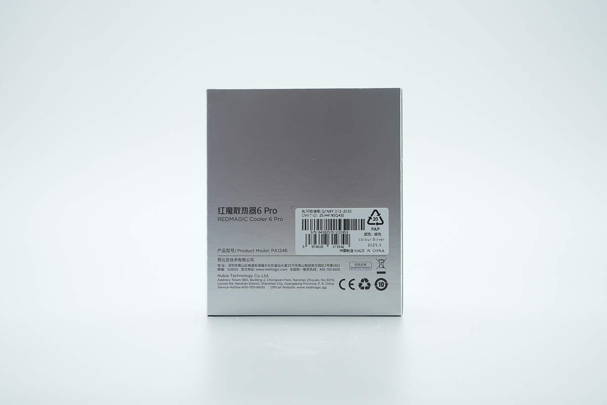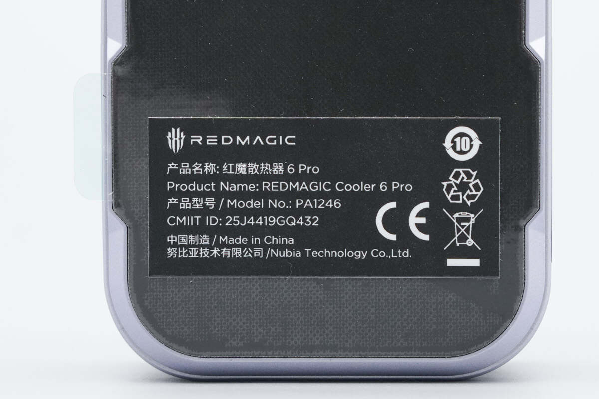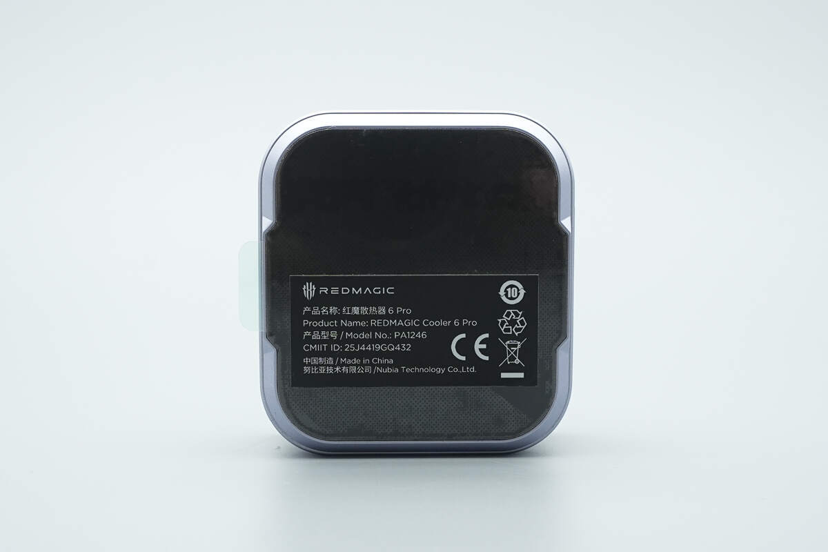 红魔散热器6 Pro初始状态底部贴有保护膜和信息贴纸。